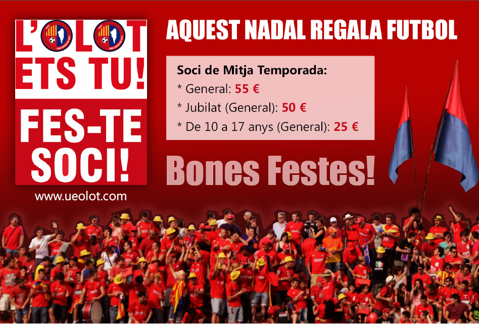 Perquè L’OLOT ETS TU, i tu també ets un dels nostres, siguis de la ciutat, de la comarca o de la província. Contagia’t de l’esperit volcànic, d’un cor vermell que batega amb força i viu l’emoció de la Segona B al costat del teu equip. Un futbol alegre i apte per a tothom, per a grans i petits, perquè la UEO és una passió i un sentiment que ens uneix, i més en aquestes dates tan assenyalades, màgiques i familiars. És el millor regal d’aquest Nadal, sens dubte. Junts més forts!