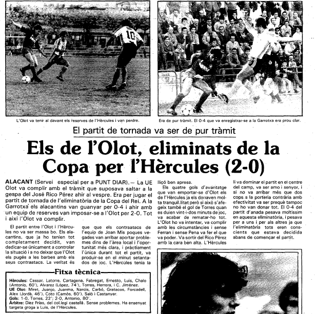 Precedents: en aquest recull de premsa tenim l’única visita de l’Olot al Rico Pérez d’Alacant. Va ser el novembre del 1983 en un partit de Copa del Rei en el qual els locals es van imposar per 2-0. L’actual director esportiu del club, Àlex Terma, va ser un dels jugadors més destacats segons les cròniques d’aquell dia (facilitades per Pep Solés).