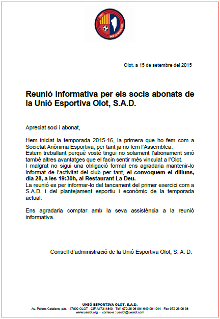 Després de celebrar la reunió informativa d’accionistes el passat dijous, ara és el torn dels socis abonats de la Unió Esportiva Olot. L’acte serà aquest dilluns 28 de setembre i es farà al Restaurant La Deu a partir de les 19:30. Esperem la vostra assistència per tractar l’activitat del club!