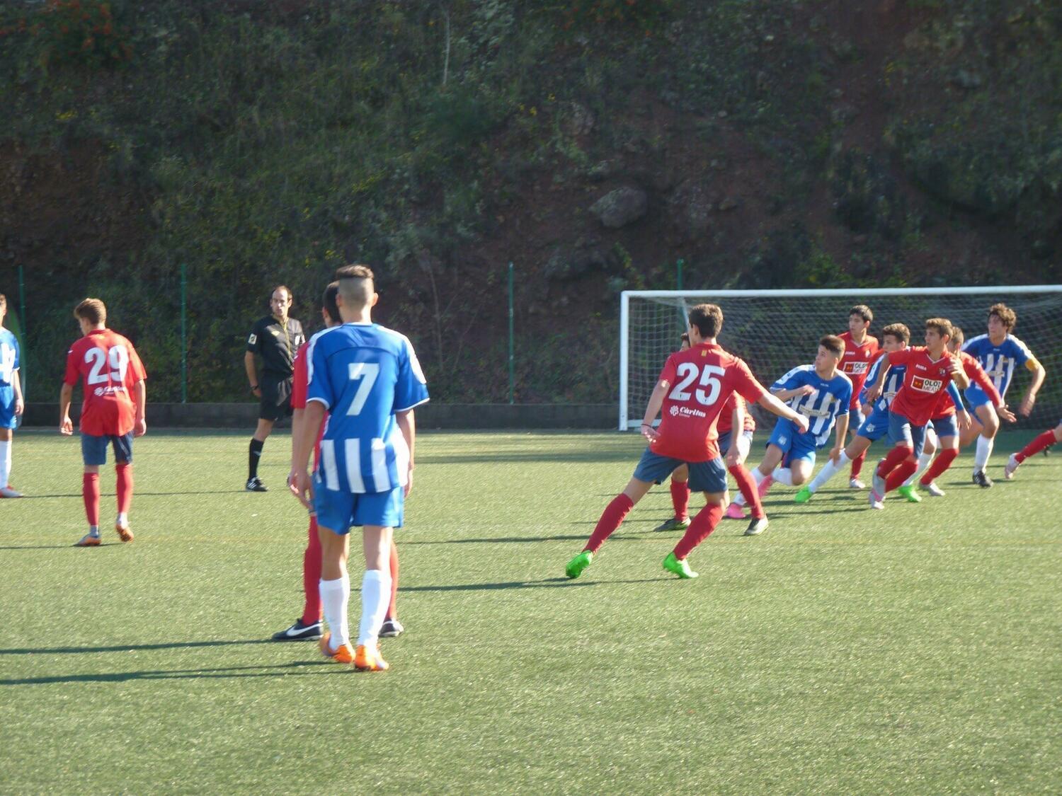 Primers compassos de dubtes i imprecisions del nostre Juvenil B, que va rebre la primer garrotada des del punt de penal tot just començar. La millora en el joc va ser ostensible a la represa i va servir per donar la volta al marcador (2-1). Però a la falta de dos minuts per acabar, van tornar a aparèixer els nervis i els rosincs ho van aprofitar per neutralitzar el resultat a la sortida d’un córner.