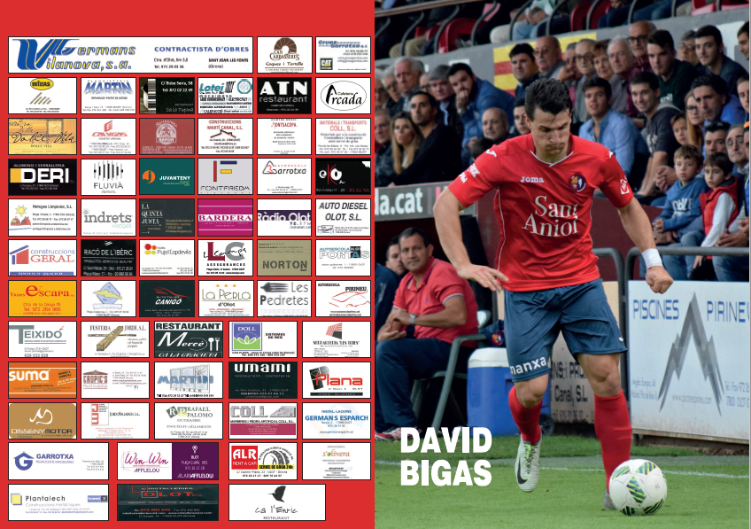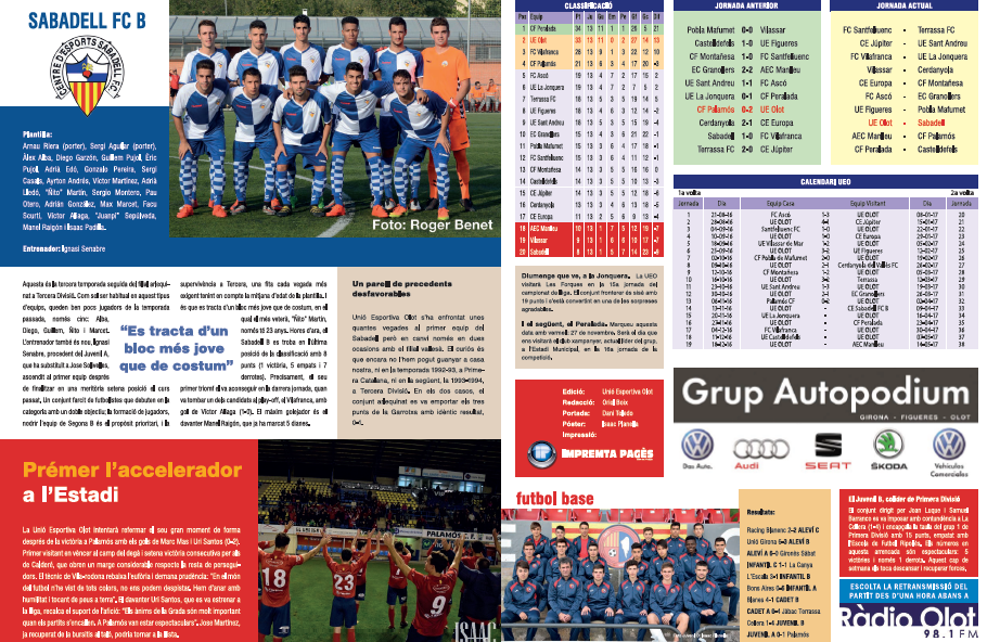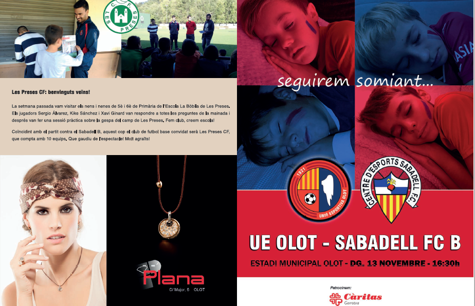 La revisteta d’aquest diumenge inclou un anàlisi de la plantilla del Sabadell B, la confiança del grup després de sis triomfs consecutius i les estadístiques de la competició (resultats de la jornada, classificació i calendari complet del conjunt olotí). En la secció del futbol base, analitzem la bona arrencada del Juvenil B, i es dedica la contraportada a la visita dels jugadors a l’Escola La Bòbila de Les Preses i a Les Preses CF, club de futbol base que rebrem aquest diumenge a l’Estadi. El desplegable és un pòster del lateral esquerre David Bigas.