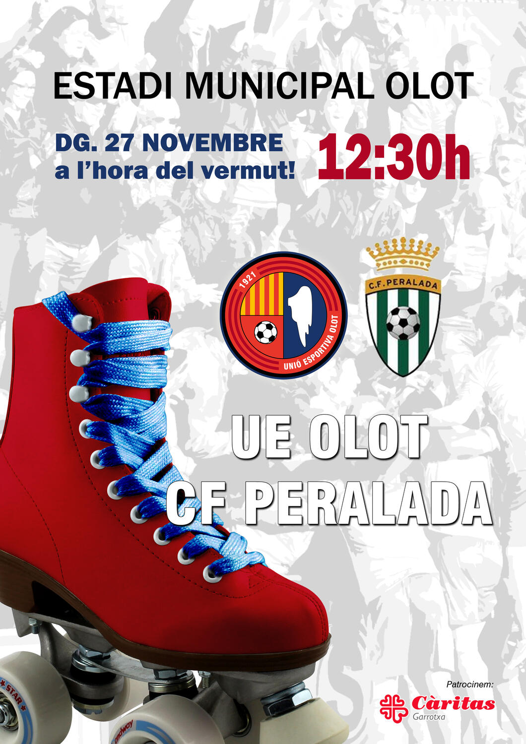 Aquest diumenge al migdia arriba a l’Estadi el duel més esperat de la temporada. Ens visita el CF Peralada, ara segona classificat, i també retrem un homenatge a les patinadores del CPA Olot, que fa poques setmanes es van proclamar campiones del món a Novara. El duel començarà a les 12:30 del migdia però abans hi haurà un esmorzar popular al bar ATN del camp de futbol.