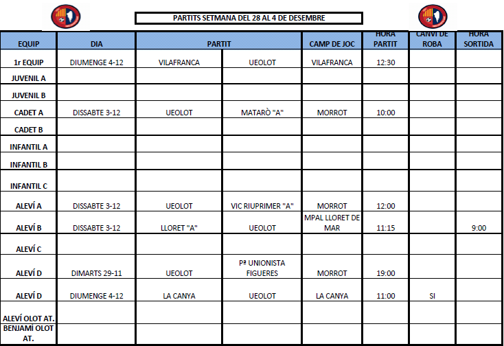 Abans de la aturada d’aquest inici de desembre, l’últim cap de setmana del mes de novembre ens ha deixat unes estadístiques de 4 victòries i 5 derrotes. Jornada amb dos partits pendents; l’Aleví D, que juga avui dimarts contra el PUF Figueres, i l’Infantil C, que va suspendre el seu compromís al camp del Cornellà de Terri. La resta de compromisos els resumim tot seguit: