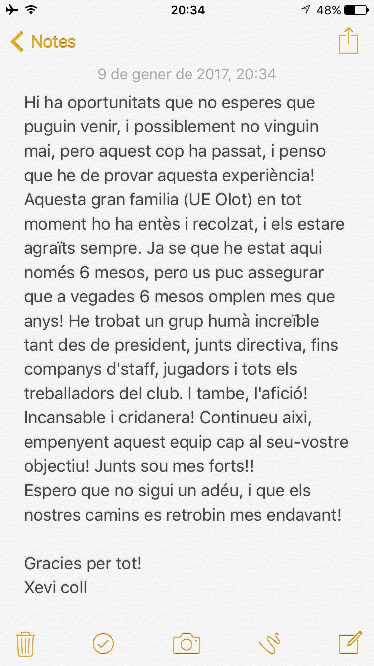 El preparador físic Xevi Coll s’acomiada de la Unió Esportiva Olot després de rebre una proposta de l’Hajduk Split, club de la Primera Divisió de Croàcia. Ahir mateix, el garrotxí va ser presentat com a ajudant de Joan Carrillo en aquesta aventura a l’estranger. Des de la UEO només podem agrair-li la implicació i la professionalitat exercida durant aquests mesos i desitjar-li tota la sort del món en el repte apassionant que l’espera. Aquesta és la carta que ens ha fet arribar des dels Balcans: