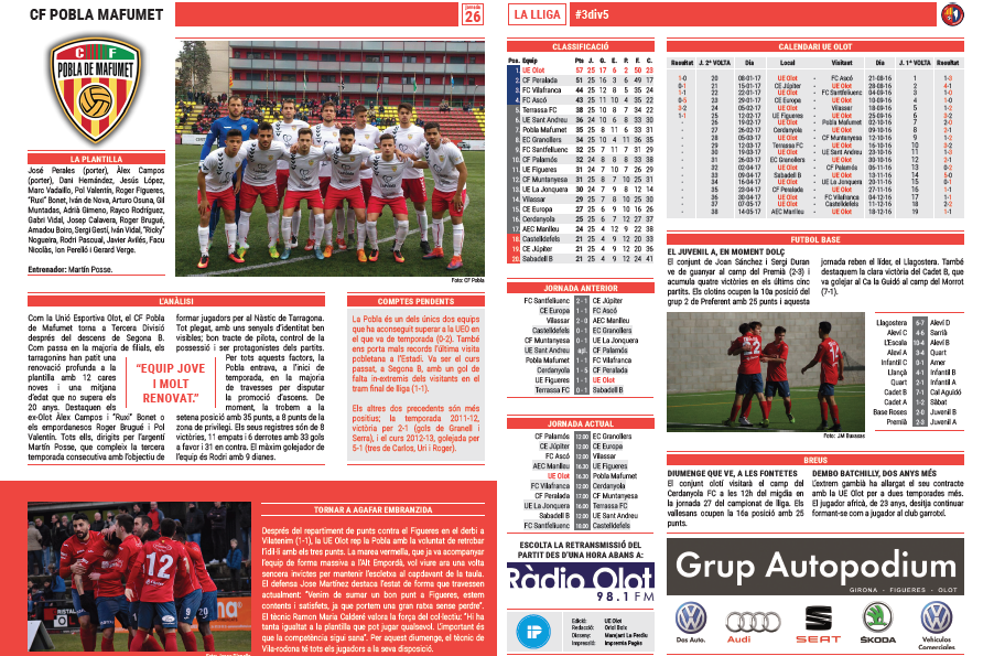 La revisteta d’aquest diumenge inclou un anàlisi de la plantilla del CF Pobla de Mafumet, la mentalitat de l’equip després de l’empat a Vilatenim i les estadístiques de la competició (resultats de la jornada, classificació i calendari complet del conjunt olotí). En la secció del futbol base, ens fixem en el bon moment de forma del Juvenil A, i es dedica la contraportada a les visites de l’AE La Canya i el CF Les Planes. El desplegable és un pòster del central Jose Martínez.