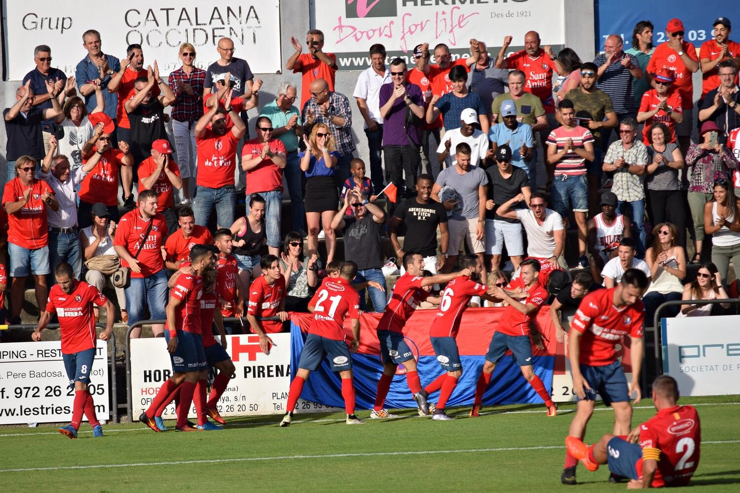 Els primers minuts de la represa van ser un allau dels de Calderé, que van disposar de bones arribades per igualar el marcador. Uri Santos, Marc Mas i Dembo, acabat d’entrar, van estar ben a prop d’anotar l’empat. Precisament el gambià es va lesionar en la cursa en contraatac de l’ocasió d’or que va tenir. En el seu lloc va entrar Alfredo, la perla de la casa, que esdevindria decisiu. I és que una centrada de l’extrem olotí la va acompanyar Marc Mas al segon pal per desfermar el deliri a l’Estadi (76′). 31è gol del killer de Sils aquesta temporada, xifra que li permet igualar els registres de Carlos Martínez, ahir també present al camp. El mateix Mas va tenir el segon i la sentència però Dani va intervenir fantàsticament per desviar una bola que es va passejar per la línia. Els darrers minuts van ser no apte per a cardíacs; l’Sporting penjant pilotes amb centrades laterals i estratègia, l’Olot traient aigua amb la l’ajuda extra dels quasi 3.000 espectadors. I el conte va acabar bé, i l’àrbitre va xiular el final i ens vam convertir en nou equip de Segona B. Baixar i tornar a pujar, bonica metàfora amb Ascensors Serra a la samarreta. Olot és de bronze, la ciutat mereix la Segona B i vosaltres sou d’una altra categoria. GRÀCIES A TOTS! HEM TORNAT!