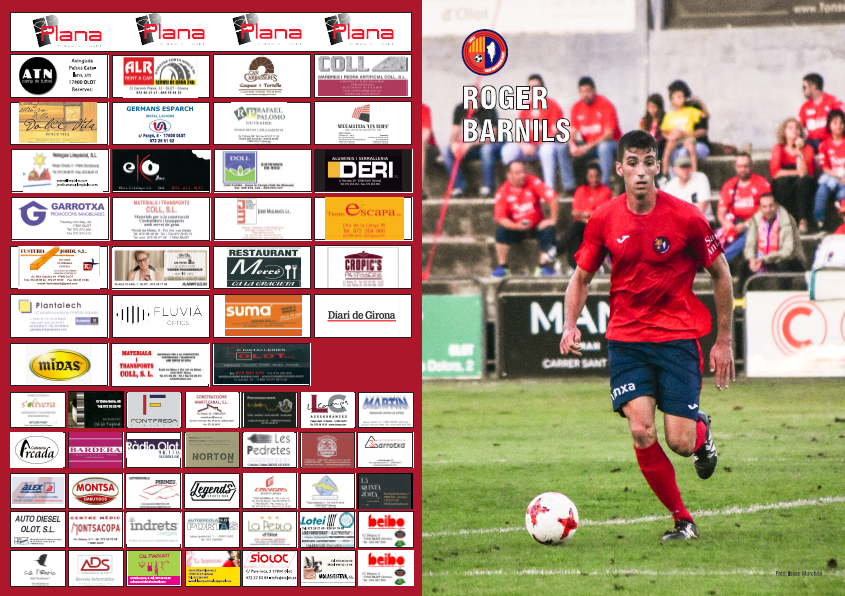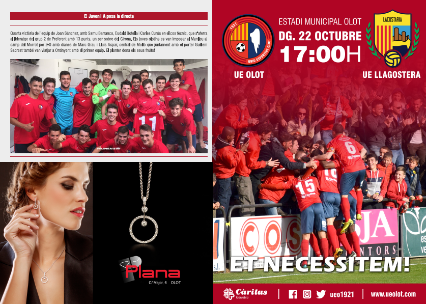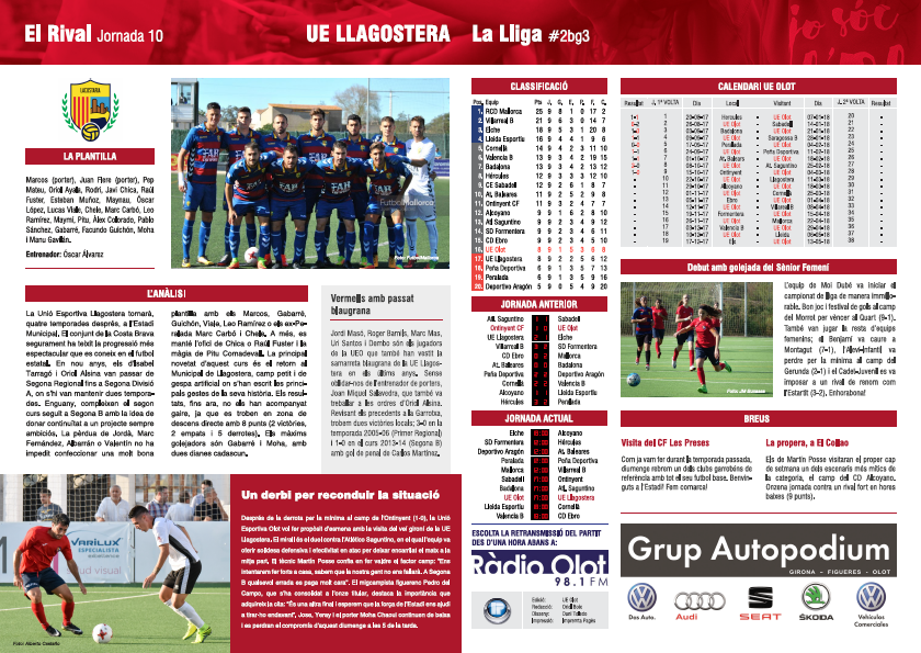 La revisteta d’aquest dissabte inclou un anàlisi de la plantilla de la UE Llagostera, l’estat d’ànim del grup després de la desfeta a Ontinyent i les estadístiques de la competició (resultats de la jornada, classificació i calendari complet del conjunt olotí). En la secció del futbol base, ens fixem en el debut amb golejada del Sènior Femení, i es dedica la contraportada al bon moment del Juvenil A, actual líder de Preferent. El desplegable és un pòster del central osonenc Roger Barnils.