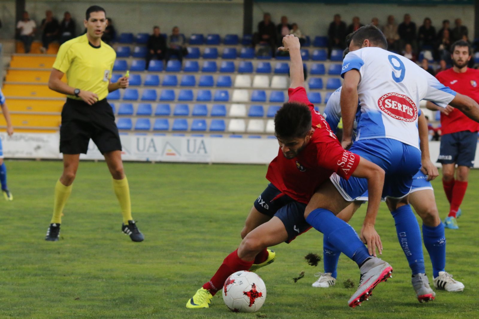 La UEO va fer la primera meitat que havia de fer al camp d’un rival tan potent com l’Alcoyano. Seriosos i ordenats en defensa, compromesos en la pressió i amb les idees clares per sortir al contraatac amb sentit i criteri. El cert és que els de José Galiana no van disparar a porteria en els primers 45 minuts, un demèrit del conjunt local però sobretot un mèrit dels nostres futbolistes, que van teixir una teranyina defensiva molt difícil de sobrepassar. De fet, les millors aproximacions de l’arrencada van ser per a l’Olot, amb dos xuts de Guzmán i Nacho que van marxar a prop del travesser. Ens sentíem còmodes i no patíem en un escenari on els equips les solen passar magres per aturar els impulsos del conjunt de casa.