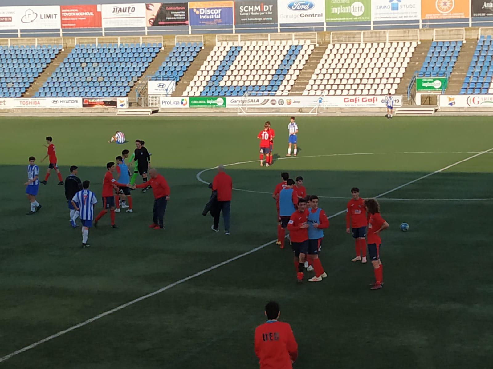 Victòria molt important davant d’un rival directe. I això que el partit no va arrencar de la manera desitjada amb el gol dels figuerencs, rematant una sortida d’un córner. Al Cadet A li va costar entrar al partit en un camp de grans dimensions i davant d’un Figueres més ben posicionat. Tot i això, els olotins mica en mica van anar trobant el seu espai per gaudir del seu moment. Fruit d’això, els de Subirana i Quintana van aconseguir l’empata a la mitja hora de joc en una jugada col·lectiva. Les alegries van continuar després del descans, ja que els vermells es van avançar amb un tir potent des de la distància. El xoc es va convertir en un anar i venir, fet que van aprofitar els empordanesos per situar la igualada. La UEO no en tenia prou i va tornar a col·locar-se per davant amb el 2-3. Però això no es va acabar aquí, ja que el Figueres va replicar amb un bon xut per l’escaire. A falta d’un quart d’hora, el Cadet A va marcar el 3-4 definitiu agafant el refús d’un llançament de falta. Va tocar patir i defensar en els últims minuts, i a sobre amb un jugador menys. Un triomf fonamental per seguir creient en l’objectiu.