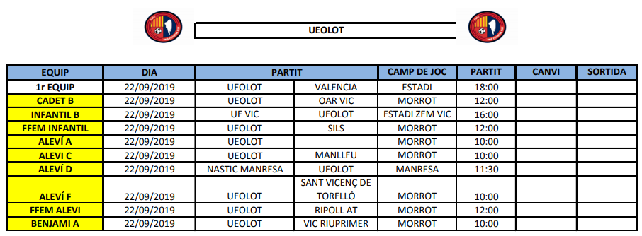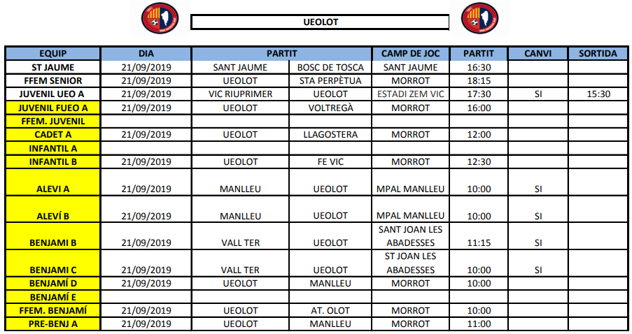 Agenda de la jornada al FUTBOL BASE (21 i 22 setembre) 18 set. 2019Oriol Boix BufiasEscola de FUTBOL, SECCIONS, General, Actualitat, Destacat, Futbol BASE, Futbol FEMENÍ0 *EN GROC són els partits amistosos