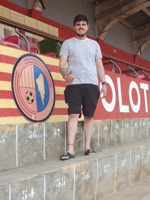 Adrià Ortega, davant de l’escut de l’Estadi
