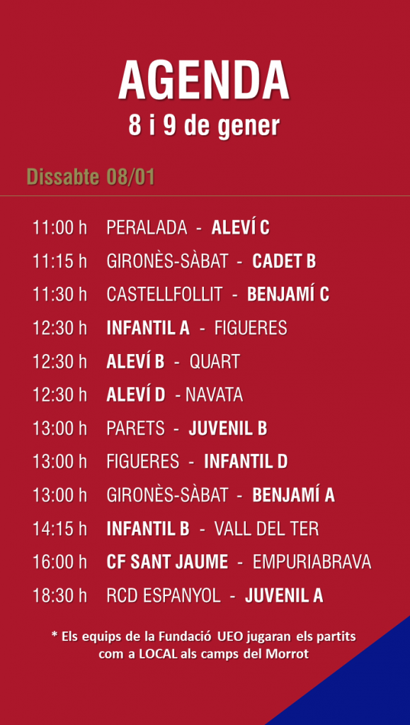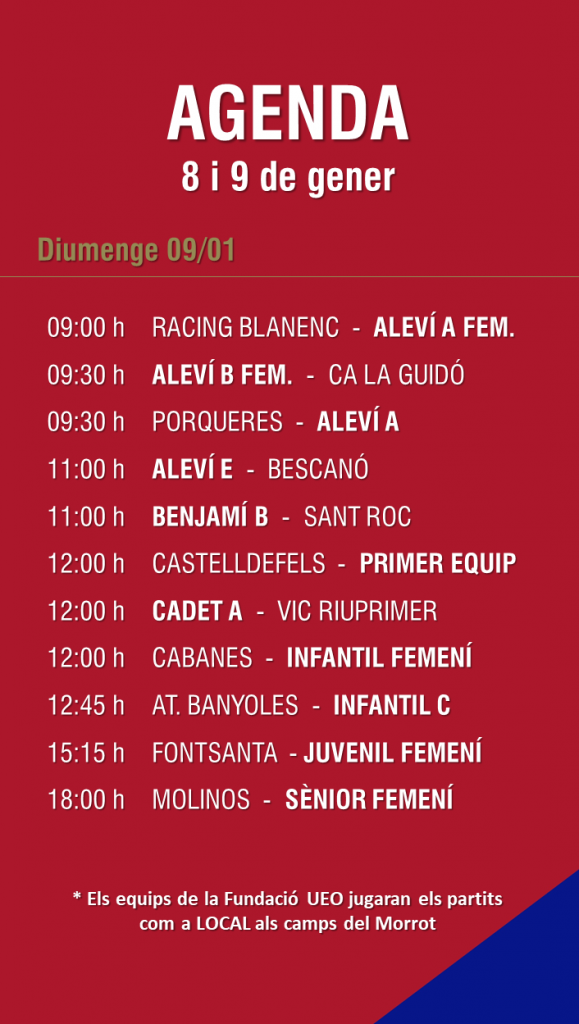 L’agenda de partits al FUTBOL BASE (8 i 9 gener) 03 gen. 2022Oriol Boix BufiasActualitat, Destacat, Futbol BASE, Notícies, Futbol FEMENÍ, Escola de FUTBOL, SECCIONS, General0