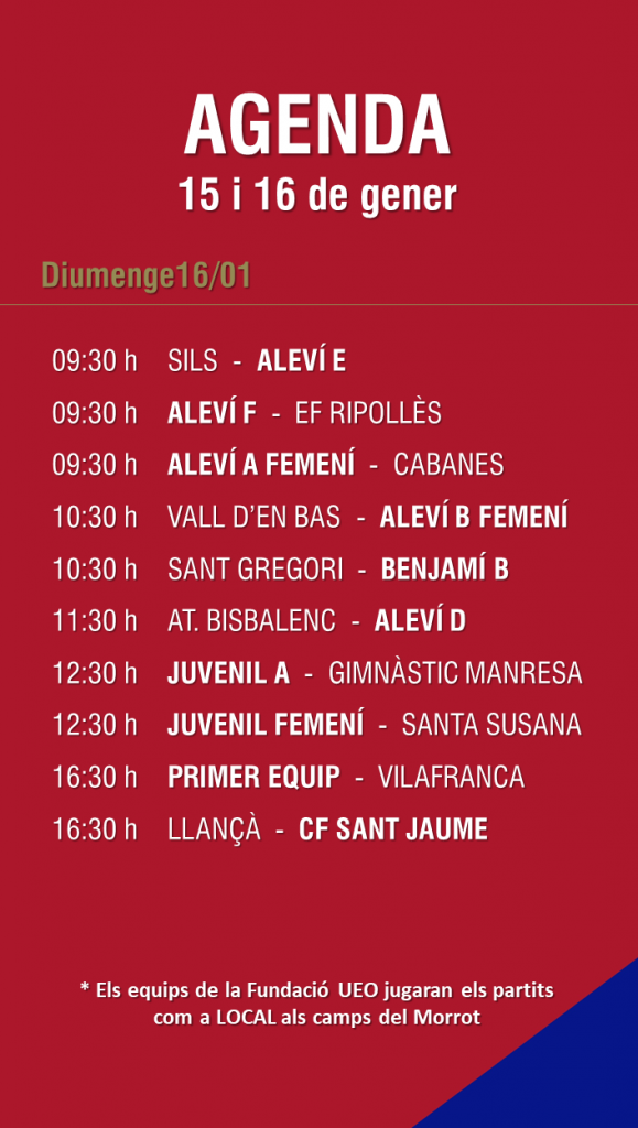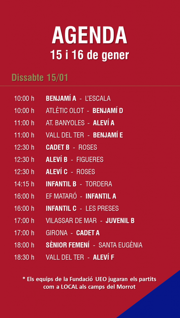 L’agenda de partits al FUTBOL BASE (15 i 16 gener) 12 gen. 2022Oriol Boix BufiasFutbol BASE, Notícies, Futbol FEMENÍ, Escola de FUTBOL, SECCIONS, General, Actualitat, Destacat0