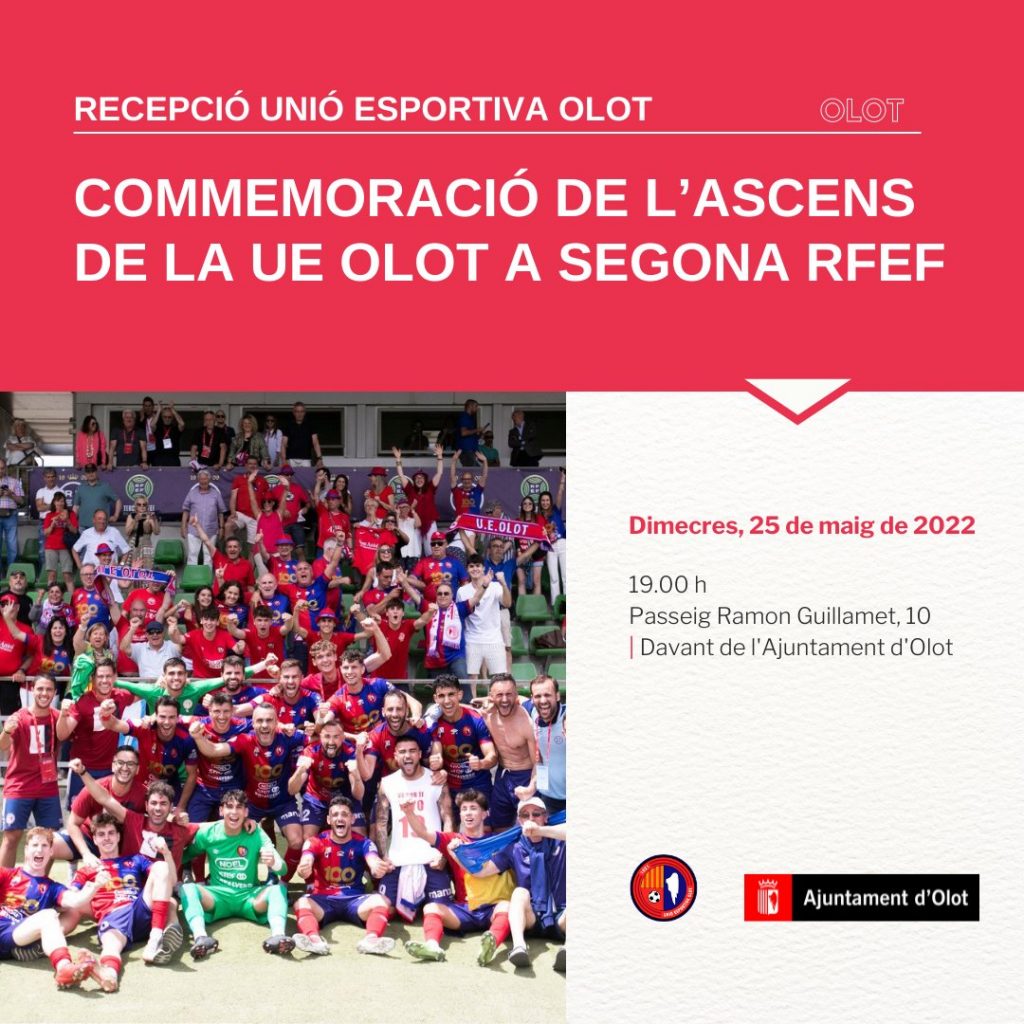 Aquest dimecres 25 de maig a les 19:00h no et perdis la recepció de la Unió Esportiva Olot davant de l’Ajuntament d’Olot. Acte institucional i celebració de l’ascens a Segona RFEF amb tota l’afició olotina que ens ha donat suport aquesta temporada. Un reconeixement de la ciutat a la tasca de jugadors, cos tècnic, directiva i treballadors del club per aquest merescut èxit obtingut aquest cap de setmana a Las Rozas. La jornada es tancarà amb un sopar del club al Restaurant La Deu.