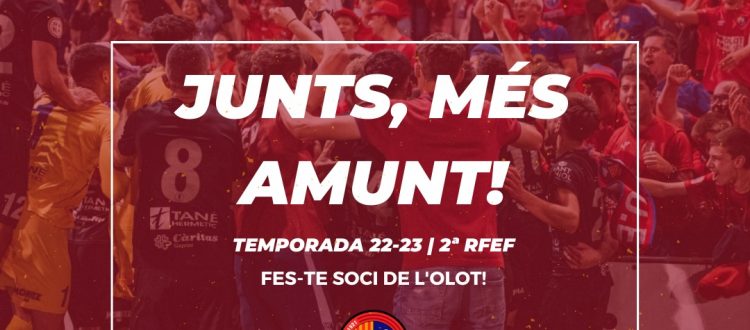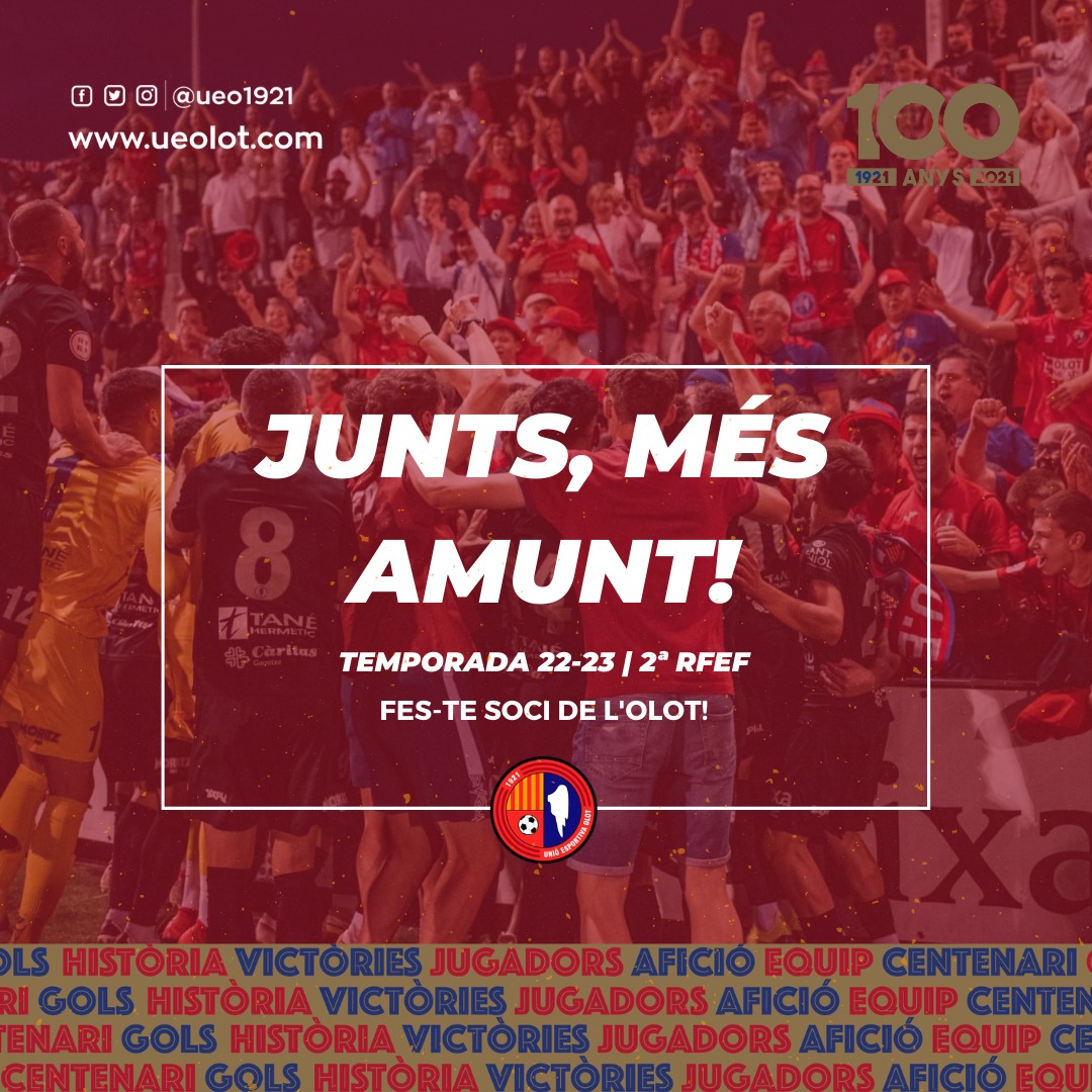 Aquest migdia s’ha presentat a l’Estadi Municipal la nova campanya de socis de la Unió Esportiva Olot per a la temporada 22-23. Sota el lema “Junts més amunt”, volem aprofitar l’embraniza de l’ascens a Segona RFEF i l’any del Centenari per ampliar la massa social. Oferim unes promocions fantàstiques que fan que el carnet et surti gratis, una pretemporada amb equips de Primera com el Barça a l’Estadi Municipal i ser el protagonista d’un projecte de futbol social sostenible únic al futbol català. Tot plegat, mantenint els preus del curs passat i allargant la franja d’edat del carnet jove.