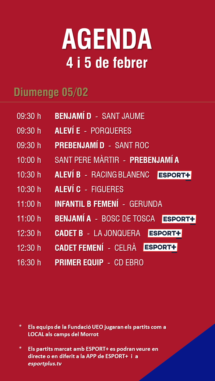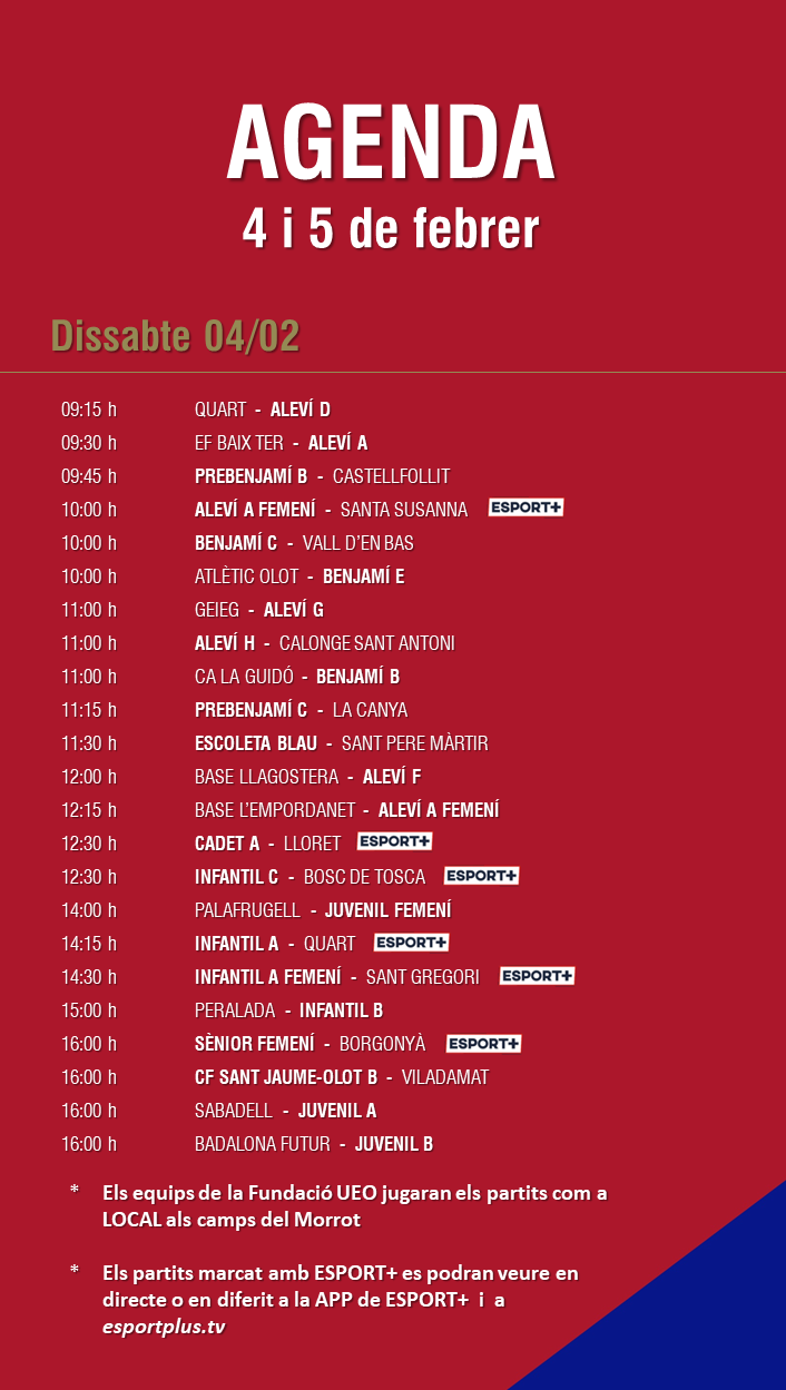 L’agenda de partits al FUTBOL BASE (4 i 5 febrer) 01 febr. 2023Oriol Boix BufiasGeneral, Actualitat, Destacat, Futbol BASE, Notícies, Futbol FEMENÍ, Escola de FUTBOL, SECCIONS0