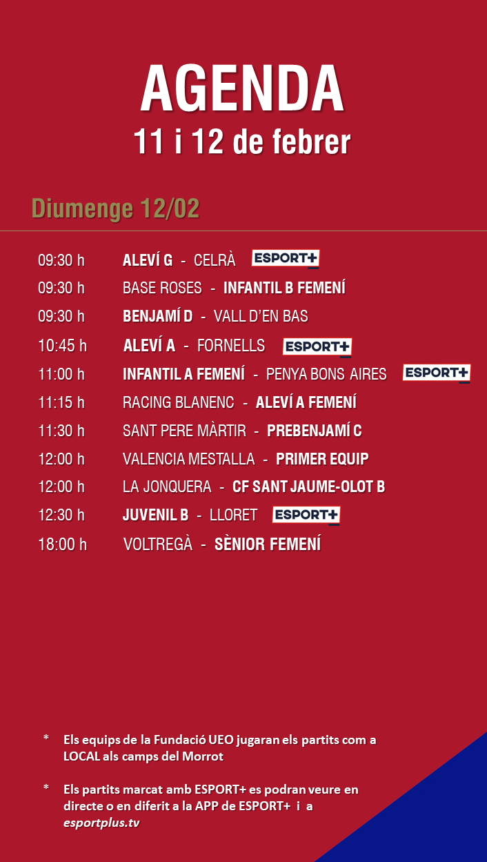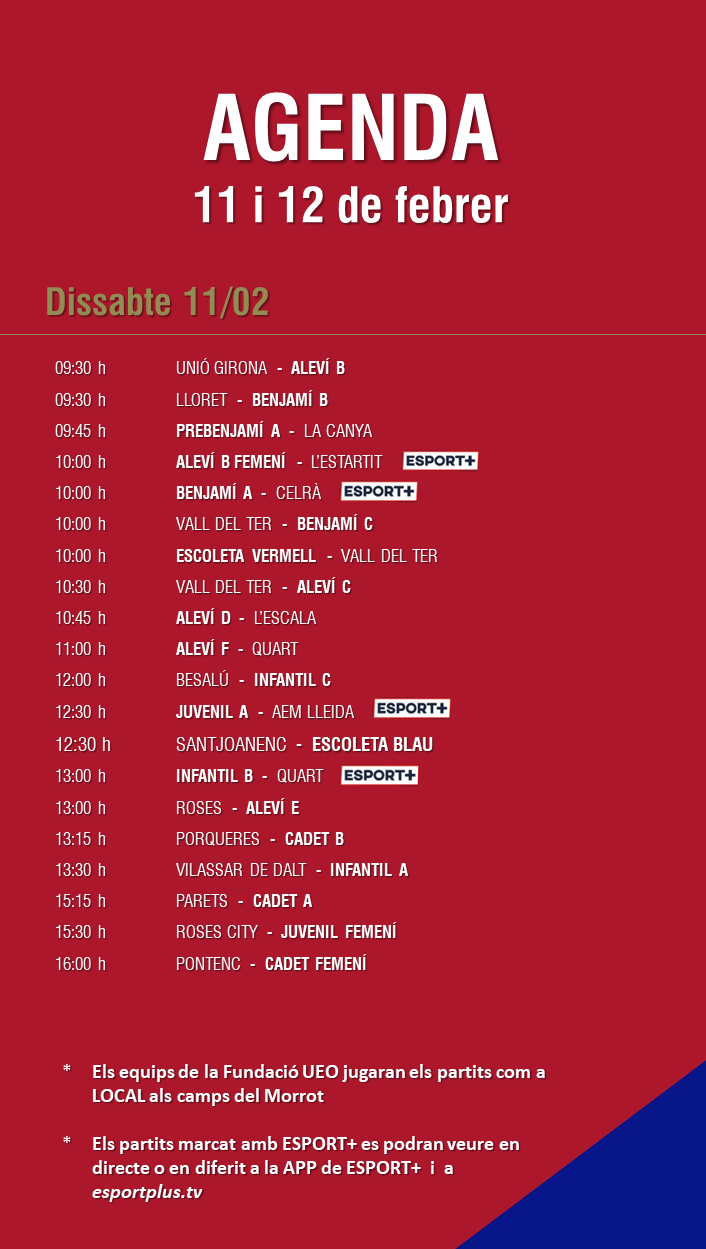 L’agenda de partits al FUTBOL BASE (11 i 12 febrer) 07 febr. 2023Oriol Boix BufiasFutbol BASE, Notícies, Futbol FEMENÍ, Escola de FUTBOL, SECCIONS, General, Actualitat, Destacat0