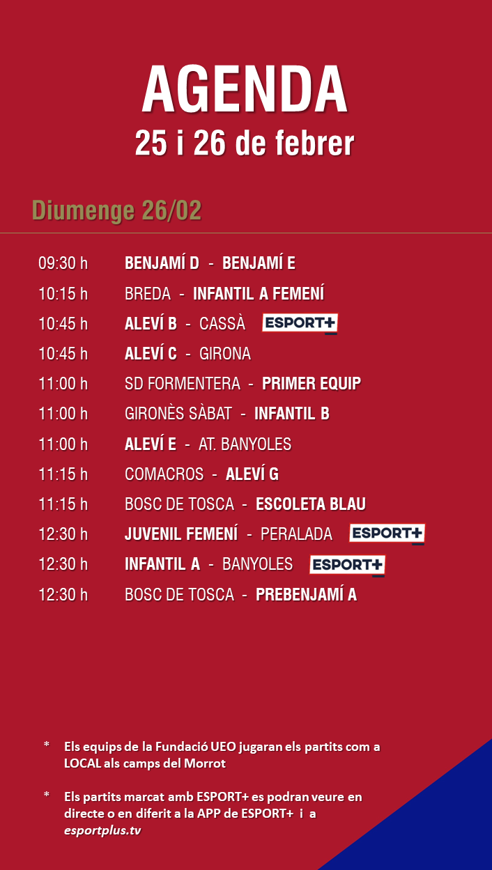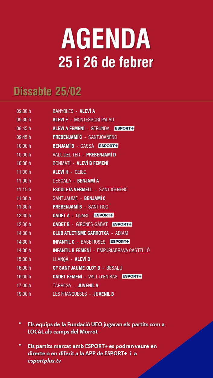 L’agenda de partits al FUTBOL BASE (25 i 26 febrer) 22 febr. 2023Oriol Boix BufiasFutbol BASE, Notícies, Futbol FEMENÍ, Escola de FUTBOL, SECCIONS, General, Actualitat, Destacat0