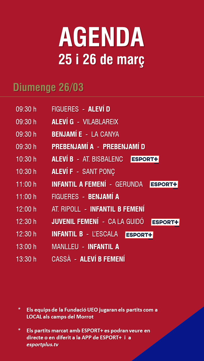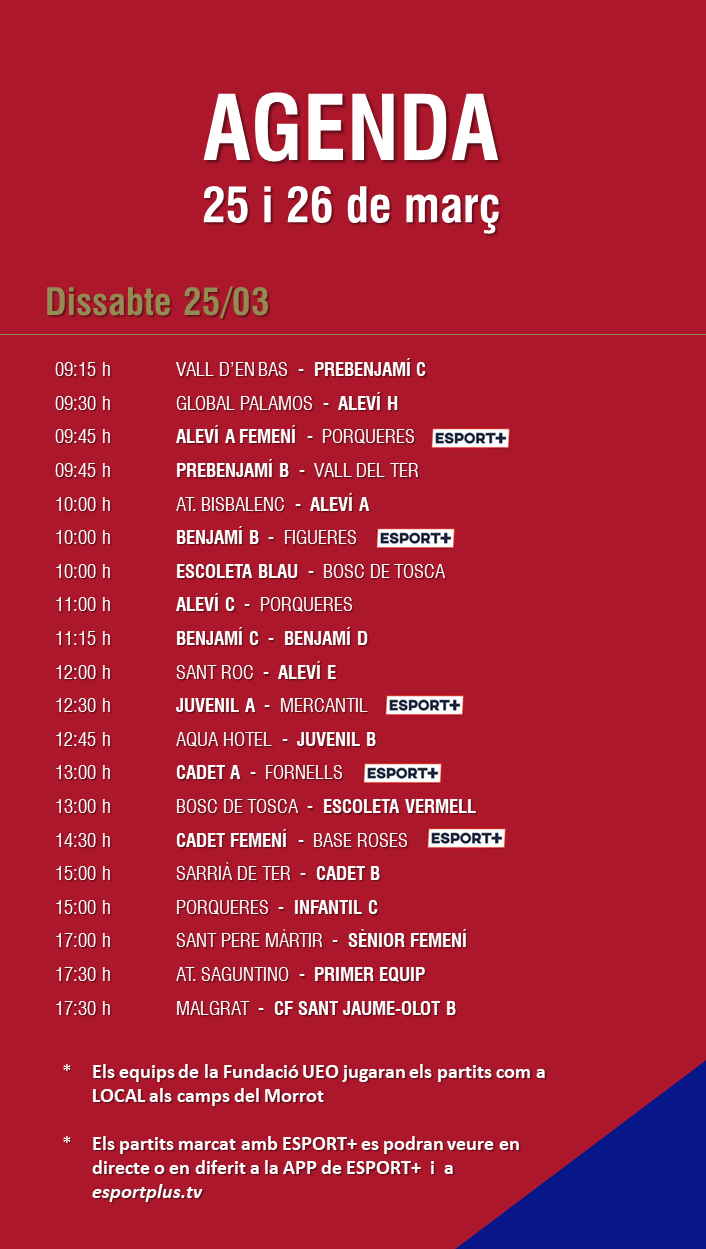 L’agenda de partits al FUTBOL BASE (25 i 26 març) 22 març 2023Oriol Boix BufiasDestacat, Futbol BASE, Notícies, Futbol FEMENÍ, Escola de FUTBOL, SECCIONS, General, Actualitat0