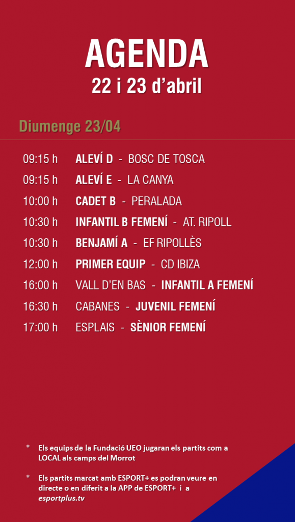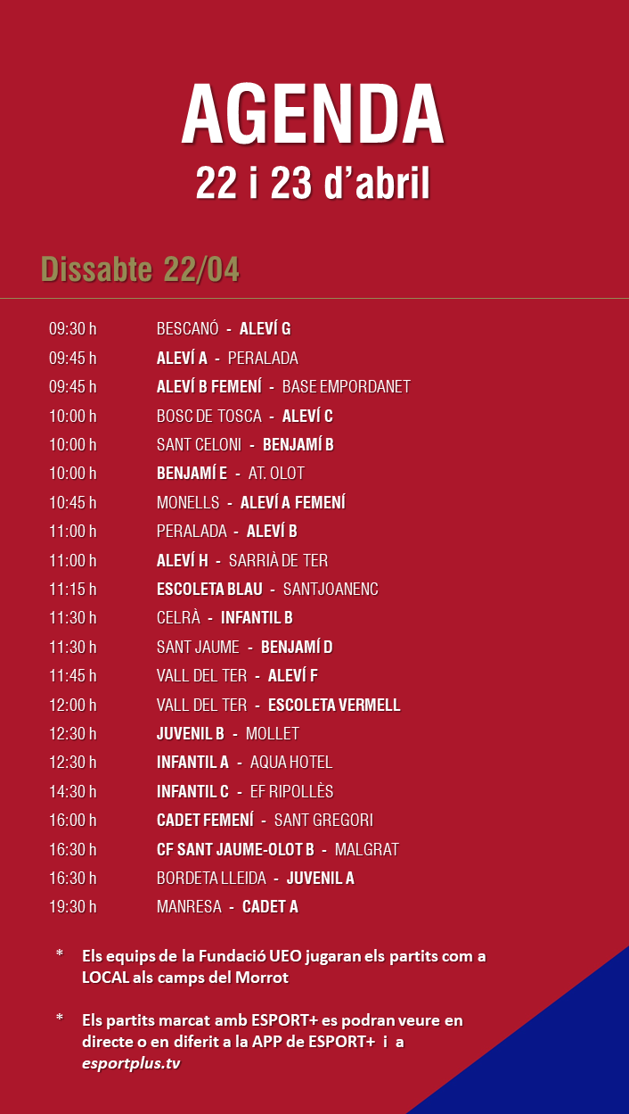L’agenda de partits al FUTBOL BASE (22 i 23 abril) 19 abr. 2023Oriol Boix BufiasFutbol BASE, Notícies, Escola de FUTBOL, SECCIONS, General, Actualitat, Destacat0