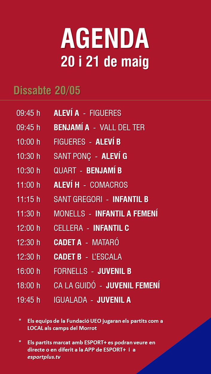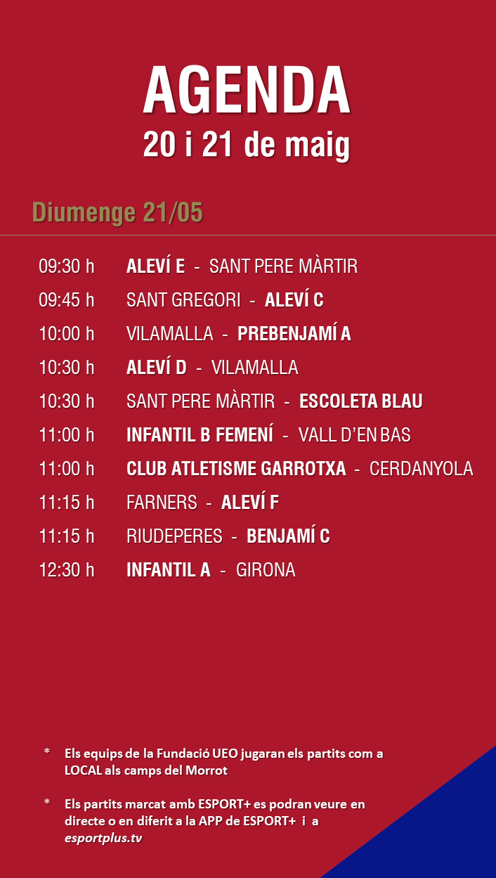 L’agenda de partits al FUTBOL BASE (20 i 21 maig) 17 maig 2023Oriol Boix BufiasFutbol FEMENÍ, Escola de FUTBOL, SECCIONS, General, Actualitat, Destacat, Futbol BASE, Notícies0