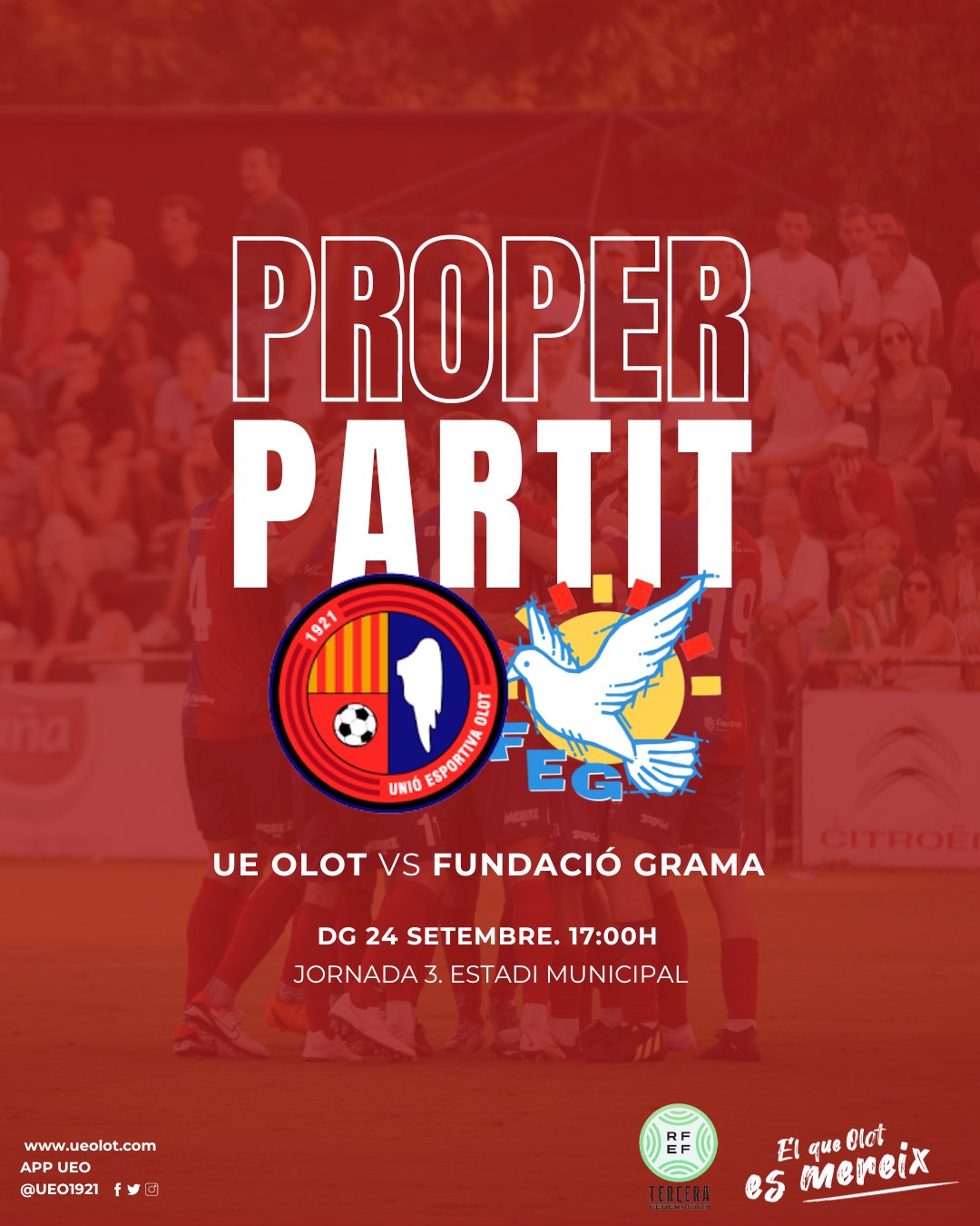 El partit, corresponent a la tercera jornada del campionat de lliga del grup cinquè de Tercera RFEF, es disputarà aquest diumenge a les 17h a l’Estadi Municipal i es podrà seguir en directe per Ràdio Olot. Busquem la segona victòria com a local i ens has d’acompanyar! Fem que això sigui el Fortí Olotí!