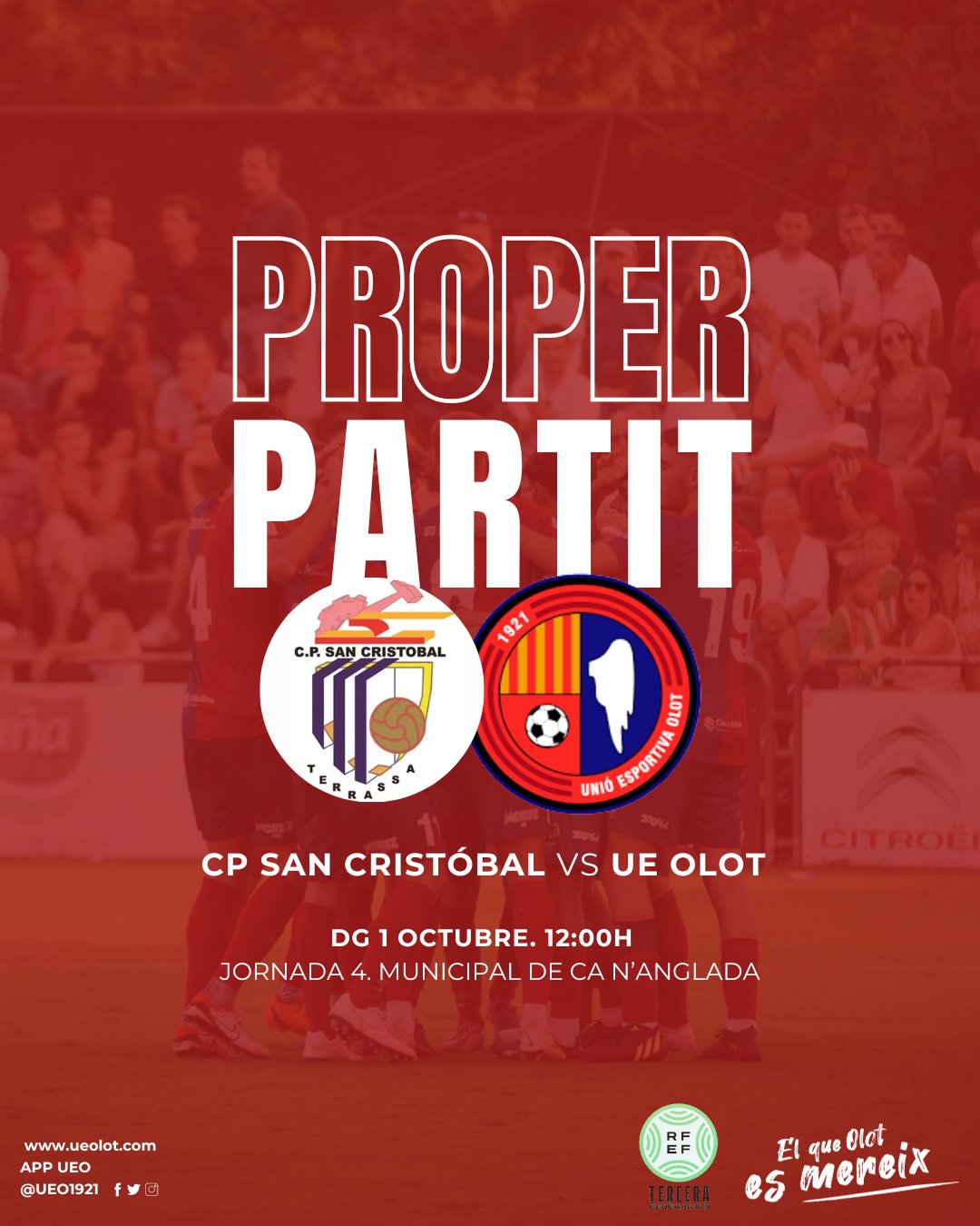 El partit, corresponent a la jornada 4 del campionat de lliga del grup cinquè de Tercera RFEF, es disputarà aquest diumenge a les 12h al Municipal Ca n’Anglada de Terrassa i es podrà seguir en directe per Ràdio Olot. Busquem mantenir la imbatibilitat i aconseguir el primer triomf fora de casa. Som-hi Olot!