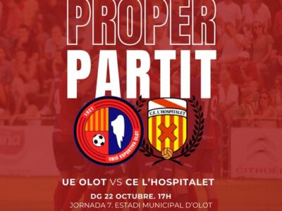 Després d'una setmana frenètica amb la victòria als Canyars i la classificació per a la final de la Copa Catalunya al Nou Sardenya, la Unió Esportiva Olot afronta aquest diumenge (17.00h) un duel d'alt voltatge a la lliga contra el CE L'Hospitalet, actual líder del grup amb dos punts més que els olotins. Un dia en el qual necessitem la nostra millor versió, tant al camp com a la grada, per tombar la imbatibilitat del conjunt riberenc, entrenat per un vell conegut com Joan Sánchez. Iniciatives com la festa "Un Dia de Party" i el sorteig de l'àpat a Ca l'Enric han de servir per augmentar l'afluència de públic a l'Estadi.
