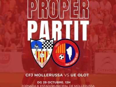 La Unió Esportiva Olot afronta aquest diumenge (12h) el primer dels dos desplaçaments consecutius al camp del CFJ Mollerussa, un recent ascendit amb bons números que compta els seus partits a casa per victòries. Els de Pedro Dólera busquen consolidar-se a la primera posició i encadenar el quart triomf consecutiu. Bruno i Marco Gil són baixa i Albert Blázquez és dubte per visitar un escenari pràcticament desconegut amb només un precedent al llarg de la història.