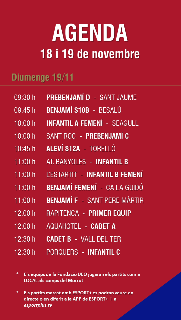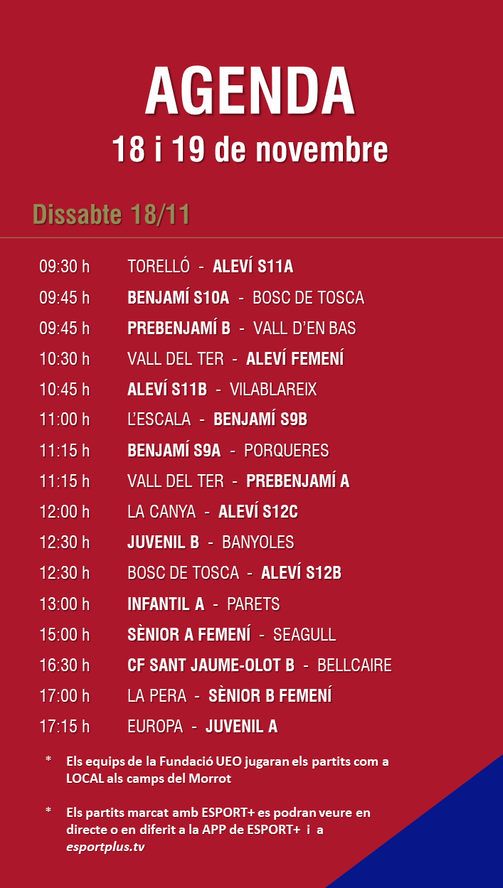 L’agenda de la jornada (18 i 19 de novembre) 15 nov. 2023Oriol Boix BufiasFutbol FEMENÍ, Escola de FUTBOL, SECCIONS, General, Actualitat, Destacat, Futbol BASE, Notícies0