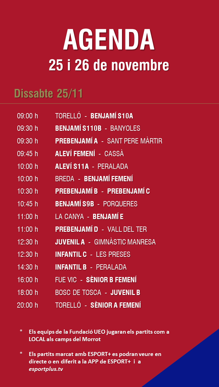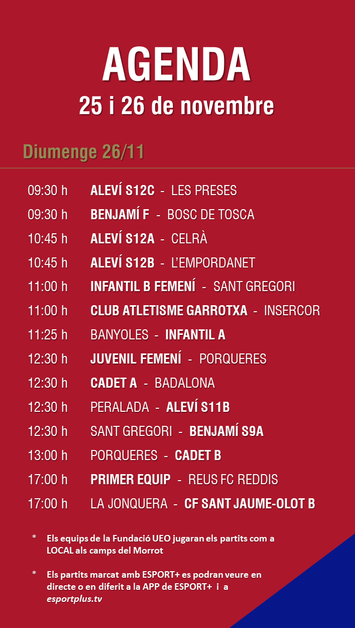 L’agenda de la jornada (25 i 26 de novembre) 22 nov. 2023Oriol Boix BufiasFutbol BASE, Notícies, Futbol FEMENÍ, Escola de FUTBOL, SECCIONS, General, Actualitat, Destacat0
