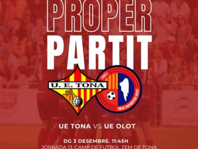La Unió Esportiva Olot té aquest diumenge (11.45) un duel de proximitat a la comarca d'Osona que promet treure espurnes. Desplaçament al camp de la UE Tona, el tercer classificat i màxim golejador amb moltes cares conegudes a la plantilla. Dólera recupera Uri González al mig del camp però encara no pot comptar amb Urri. L'objectiu, mantenir el lideratge i les bones sensacions a domicili en l'última sortida de l'any 2023.
