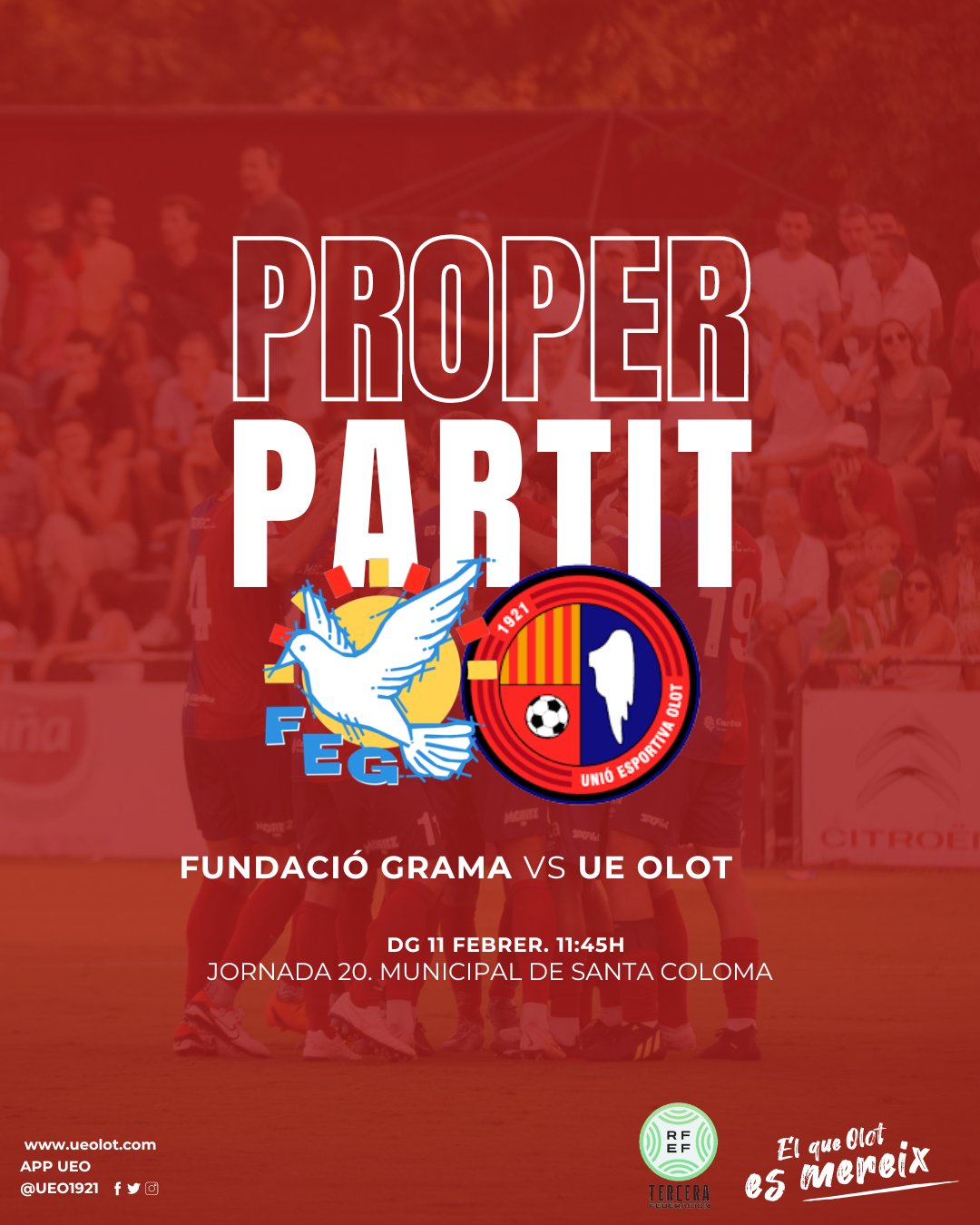 El partit, corresponent a la jornada 20 del campionat de lliga del grup cinquè de Tercera Federació, es disputarà aquest diumenge a partir de les 11.45h al Nou Municipal de Santa Coloma i en directe per Ràdio Olot. A seguir amb la bona ratxa a domicili! Som-hi Olot!