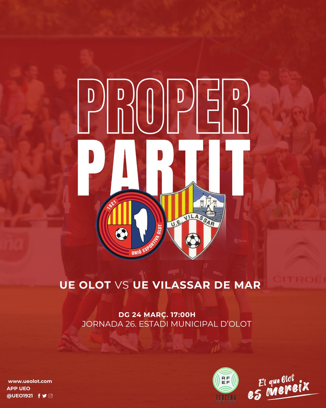 El partit, corresponent a la jornada 26 del campionat de lliga del grup cinquè de Tercera Federació, es disputarà aquest diumenge a les 17h a l’Estadi Municipal d’Olot i en directe per Ràdio Olot. Novament, obrim la promoció especial per a tots els que vinguin amb la samarreta de l’Olot, que podran optar al sorteig d’un àpat per a dues persones al Restaurant Les Pedretes d’Olot. També ens acompanyarà el futbol base del CF Les Preses. Tot plegat, per tancar una setmana ben intensa amb tres partits com a local i una final de Copa Catalunya amb un alt component emocional i ambiental. Ens toca seguir, ens toca guanyar! Fem-ho junts!