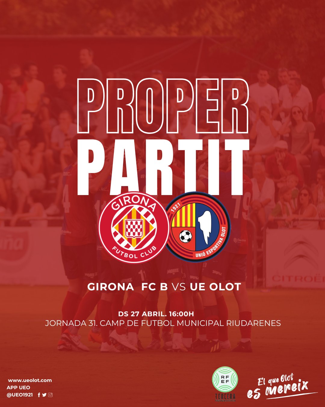El partit, corresponent a la jornada 31 del campionat de lliga del grup cinquè de Tercera Federació, es disputarà aquest dissabte a les 16h al Municipal de Riudarenes i en directe per Ràdio Olot. Un escenari amb l’aforament molt limitat (només 40 entrades per a compromisos del club) i amb previsió de pluja que esdevindrà una nova oportunitat per aconseguir el títol i l’ascens. Som-hi, Olot! Ho hem de rematar!
