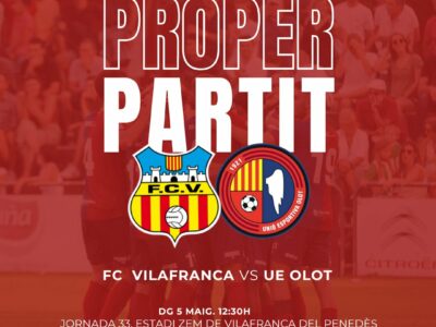 La Unió Esportiva Olot tanca l'any com a foraster amb el desplaçament al camp del FC Vilafranca, que es juga la permanència a la categoria, ara a dos punts de distància. Els de Pedro Dólera, amb la baixa d'Uri Ayala, volen rematar un curs de somni amb una altra victòria per seguir batent rècords al capdavant de la taula. Molt per decidir en una jornada unificada amb tots els partits a dos quarts d'una del migdia.