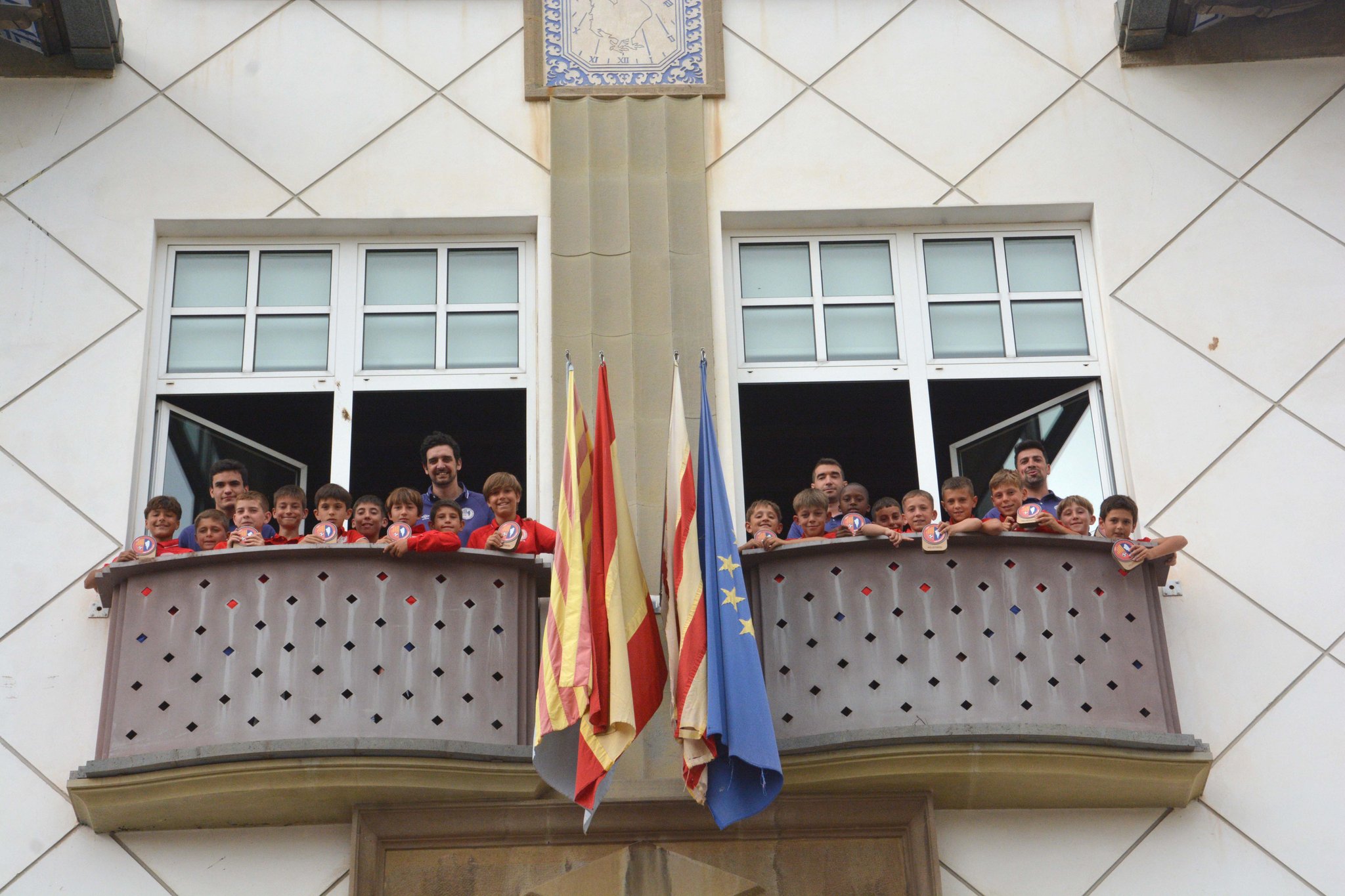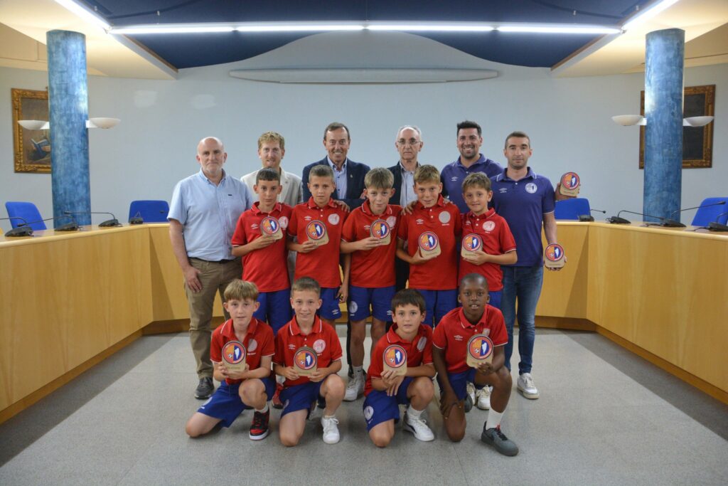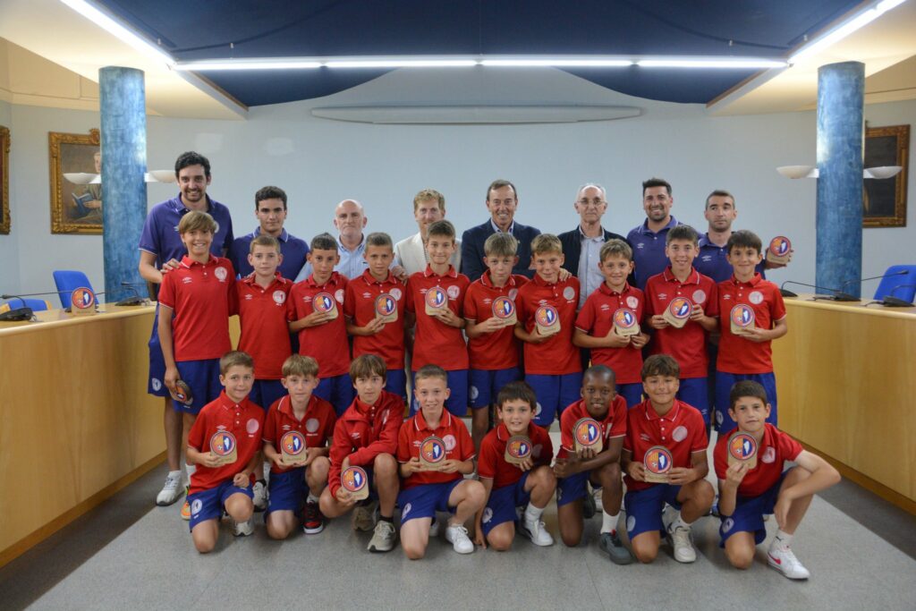 Aquest dimecres s’ha fet a l’Ajuntament d’Olot la recepció per als dos equips federats de la Fundació UE Olot que han quedat campions de les seves respectives lligues. Estem parlant del Sub12-B de Primera Divisió, dirigit per Ivan Pagès i Marc Pagès, i el Sub11-A de Preferent, dirigit per Toni Coma i Edu Coromina. Un acte institucional però ben especial per als joves olotins, que han obsequi abans dels parlaments, fotografies de rigor, signatures al llibre d’honor i sortida al balcó del consistori municipal.