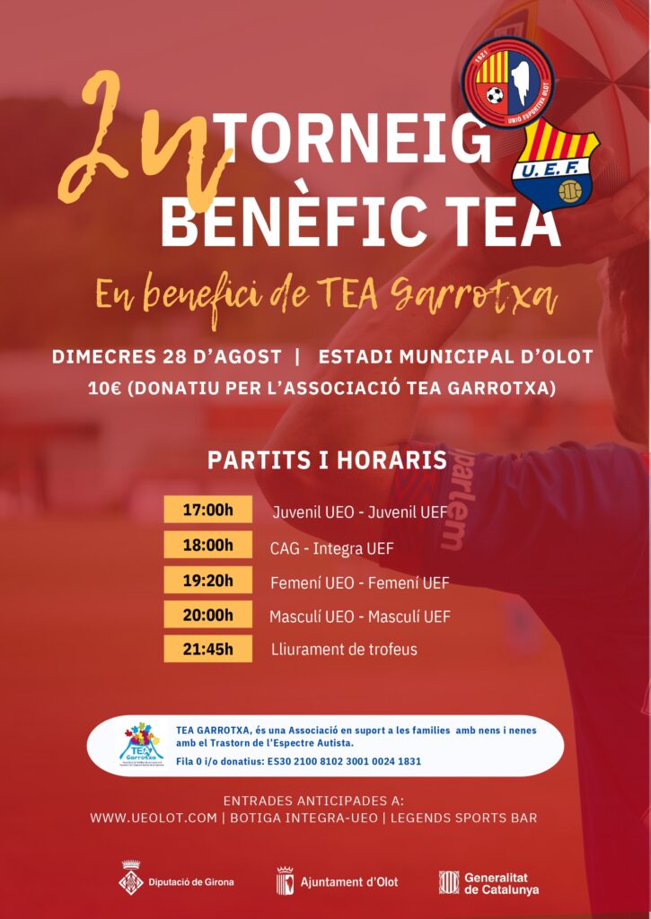 Aquest dimecres 28 d’agost es celebra la segona edició del Torneig TEA, cita benèfica entre diverses seccions de la Unió Esportiva Olot i la Unió Esportiva Figueres. Tindrà lloc a partir de les 17h a l’Estadi Municipal d’Olot amb partits del Juvenil A, Club Atletisme Garrotxa, Sènior Femení i Sènior Masculí. Tots els beneficis aniran destinats a TEA Garrotxa, entitat amb qui tenim conveni de col·laboració des de fa uns quants anys. El preu únic és de 10€ (menors de 10 anys: Gratuït) i les entrades ja es poden comprar al nostre web, Botiga Integra-UEO i Legends Sports Bar.