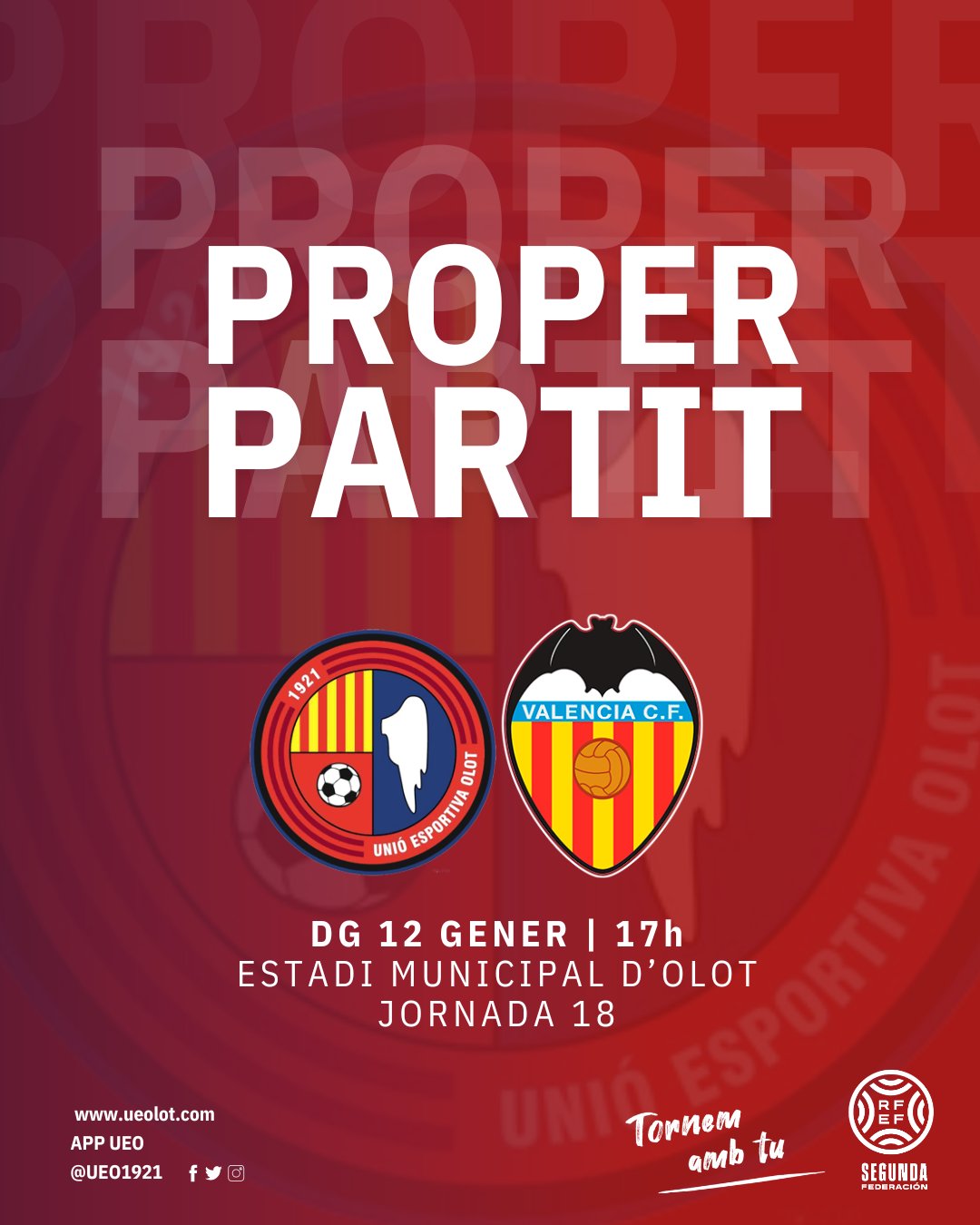 El partit, corresponent a la jornada 18 del campionat de lliga del grup tercer de Segona Federació, es disputarà aquest diumenge a les 17h a l’Estadi Municipal d’Olot i es podrà seguir en directe per Ràdio Olot. A més, comptarem amb la presència del futbol base del CE Besalú i de l’Escola Malagrida i també farem reconeixement a Olot Meats, patrocinador de la Fundació UE Olot. No hi podeu faltar! Junts començarem l’any amb bon peu!