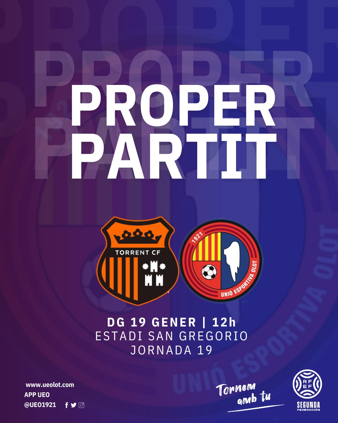 El partit, corresponent a la jornada 19 del campionat de lliga del grup tercer de Segona Federació, es disputarà aquest diumenge a les 12h del migdia al Municipal San Gregorio de Torrent. Es podrà seguir en directe per Ràdio Olot i la plataforma de pagament FootballClub. Som-hi Olot! A sumar fora de casa!