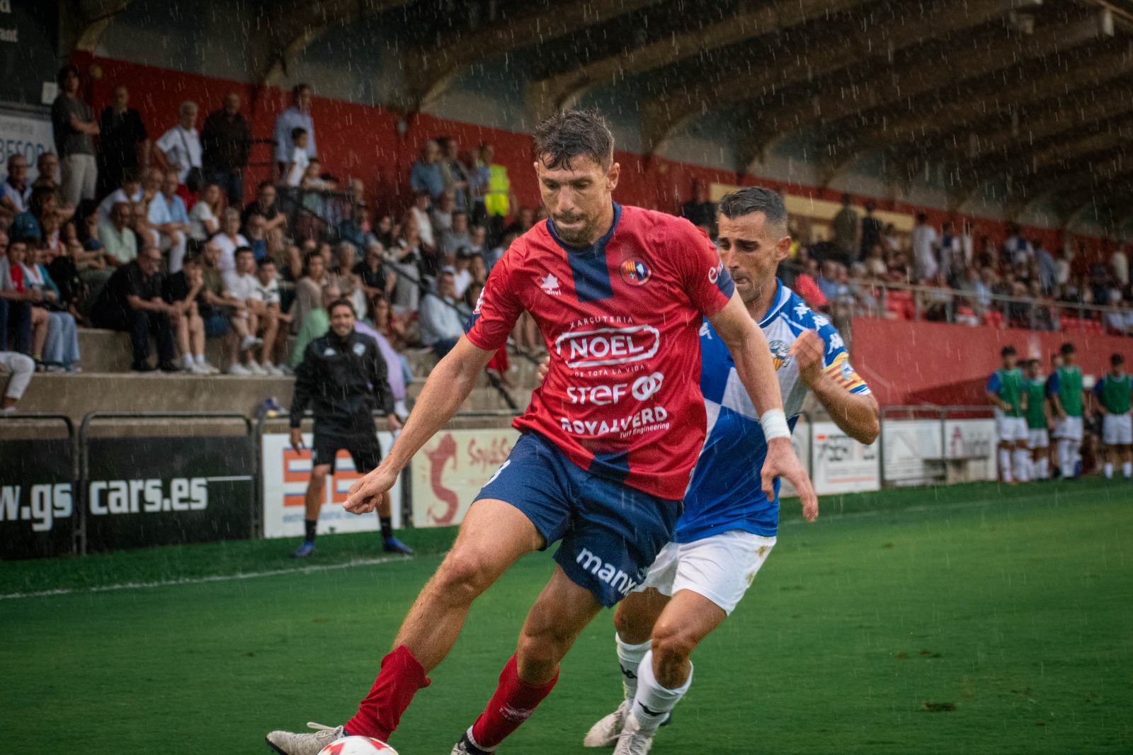 Amb la superioritat numèrica, l’Olot va sortir més decidit a la segona meitat i Guillem Farrés ho provar amb una centrada que es va enverinar. El xàfec era cada cop més notori i en aquest cas el Sabadell va optar per nedar i guardar la roba. Els de Ferran Costa es van defensar amb un bloc baix difícil de penetrar tot i les bones internades de Joel Arumí, que va redebutar amb la samarreta olotina. També es va estrenar Guillem Barrés, cedit pel Nàstic, molt segur a l’eix central fent parella amb Ayala. I en els últims minuts, protagonisme per als joves del CF Sant Jaume-Olot B i Juvenil A, que no es van arronsar i van plantar cara a jugadors molt contrastats.