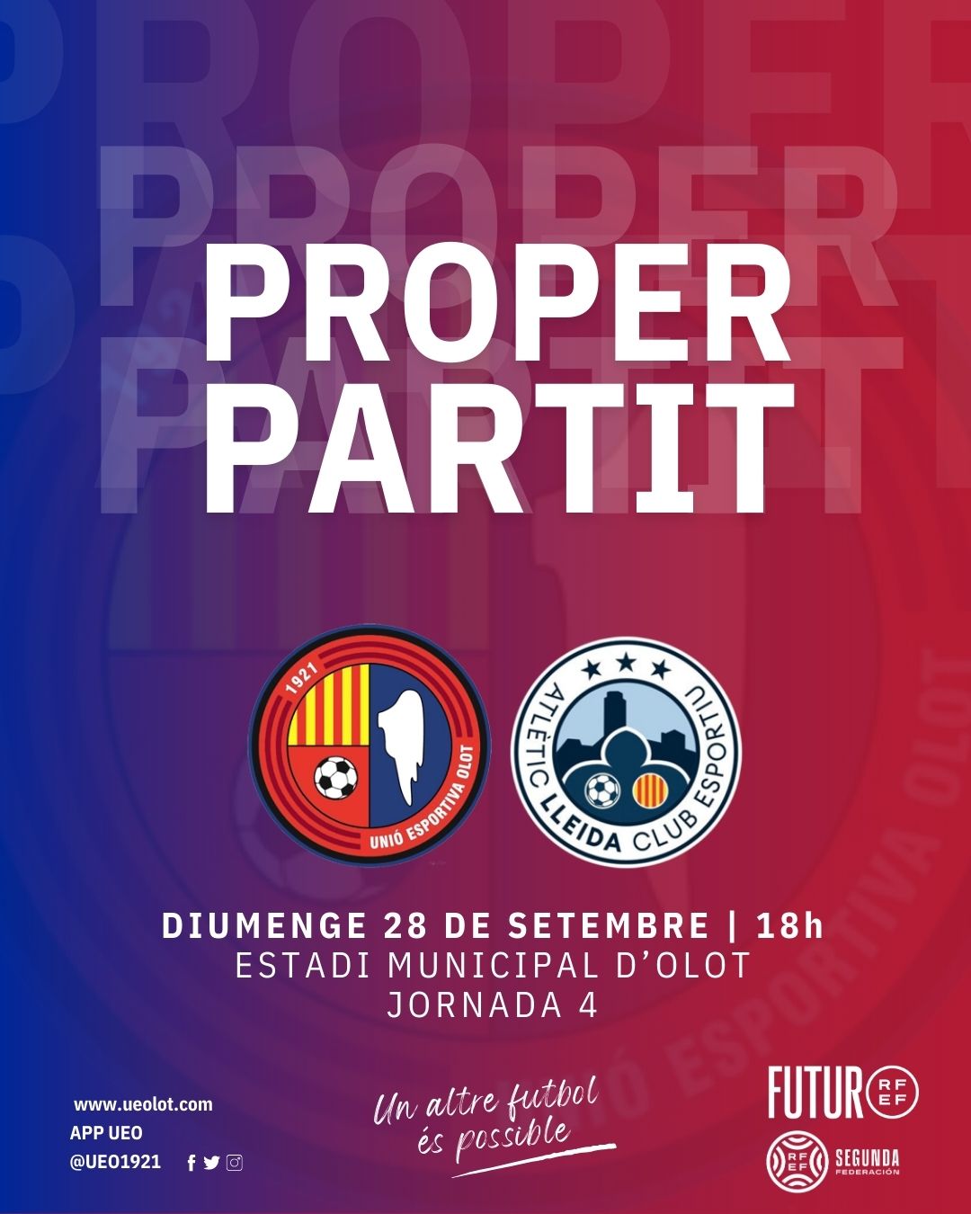 El partit, corresponent a la jornada 4 del campionat de lliga del grup tercer de Segona RFEF, es disputarà aquest diumenge a les 18.00h en directe per Ràdio Olot i La Xarxa+. Tothom qui vingui amb la samarreta de l’Olot entrarà en el sorteig d’un àpat per a dues persones a l’Hotel Riu Fluvià. A més, encetem “El Xou del Xut” per marcar des del mig del camp al descans del partit (cal apuntar-se a l’entrada) i els jugadors i cos tècnic faran el Tercer Temps i visitaran el Legends Sports Bar després del matx independentment del resultat. Tothom a l’Estadi! Junts podem amb tot!