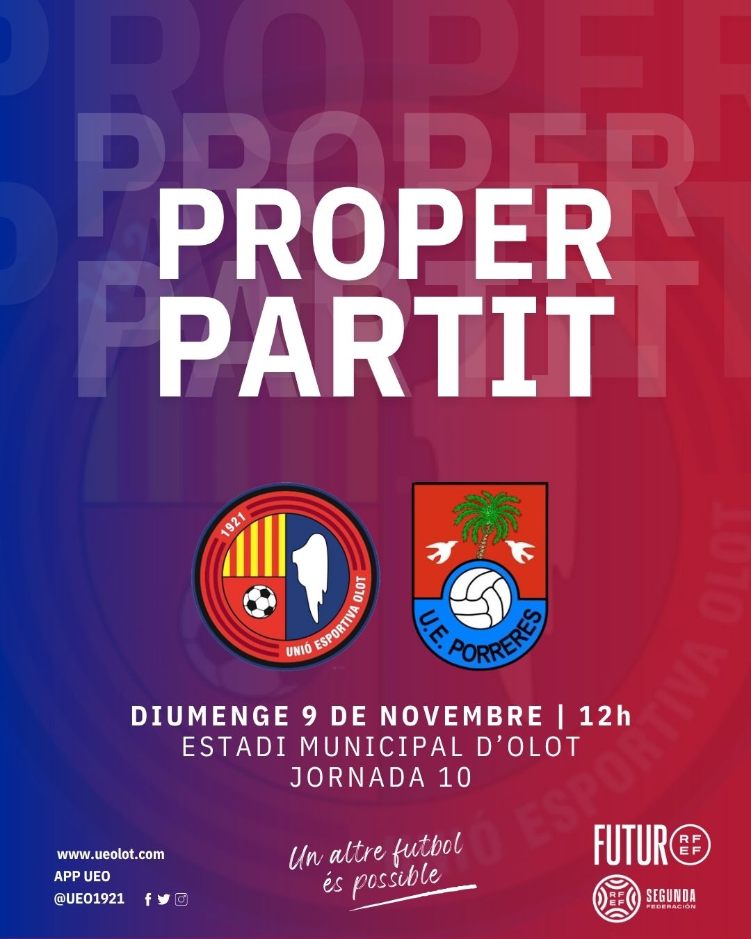 El partit, corresponent a la jornada 10 del campionat de lliga del grup tercer de Segona Federació, es disputarà aquest diumenge a partir de les 12 del migdia a l’Estadi Municipal d’Olot i en directe per Ràdio Olot. Comptarem amb el bus del Banc de Sang i Teixits a l’exterior del camp (de 10 a 14h) i amb la visita del CF Sant Roc i els equips Sub-9A i Sub-9B de la Fundació UE Olot. A més, “El Xou del Xut” al descans per a majors de 30 anys i sorteig d’un àpat per a dues persones al Legends Sports Bar per a qui vingui amb la samarreta de l’Olot. Omplim la grada, tots de vermell!