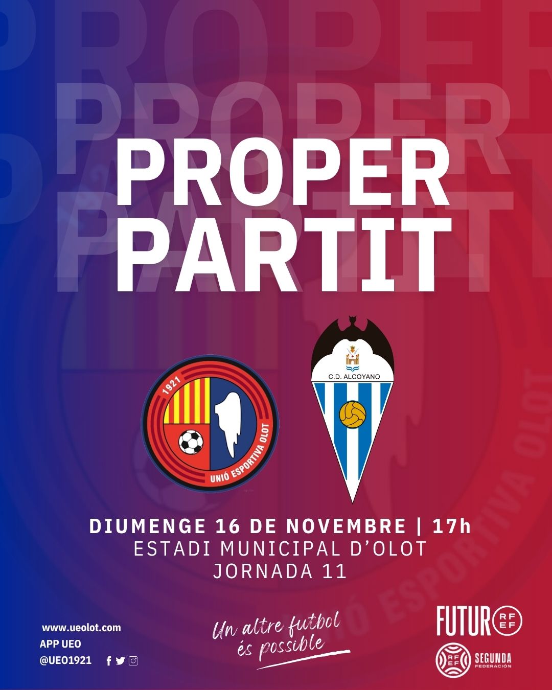El partit, corresponent a la jornada 11 del campionat de lliga del grup tercer de Segona Federació, es disputarà aquest diumenge a les 17h a l’Estadi Municipal d’Olot i en directe per Ràdio Olot. Amb la visita del CF Les Preses i dels alumnes de l’Escola la Bòbila, també amb El Xou del Xut per a menors de 18 anys i el sorteig d’un àpat per a dues persones a la Barra d’en Regue per a qui vingui amb la samarreta de l’Olot. A més, recuperem El Tercer Temps, just després del partit a l’ATN Bar Restaurant. Un munt d’al·licients per a viure una gran tarda al teu costat. Ens hi acompanyaràs, oi? Junts cap a la victòria!
