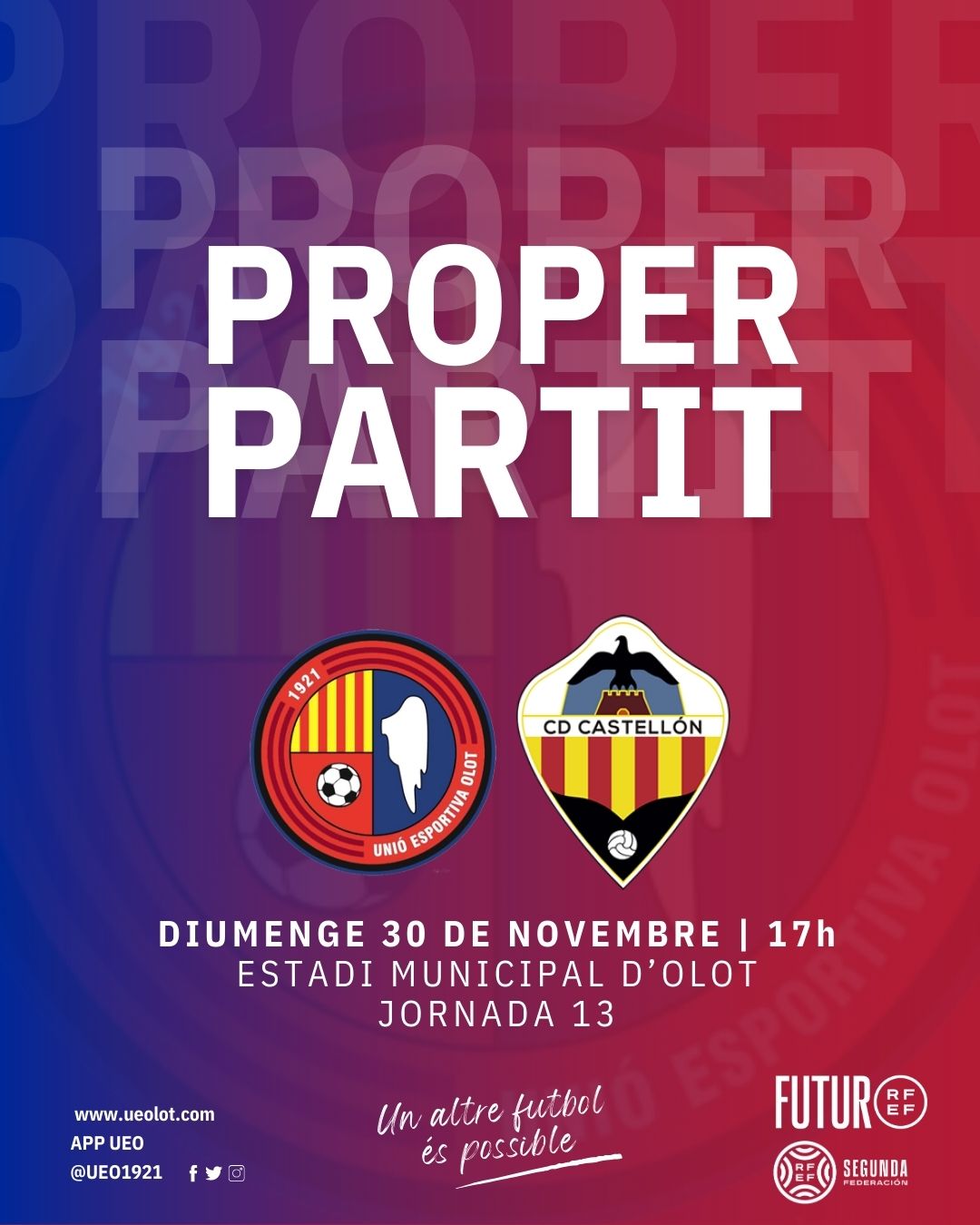 Aquest diumenge ens visita el CD Castellón B, filial del CD Castellón i fundat l’any 1958. Ha competit la majoria de temporades a la Tercera Divisió valenciana fins aconseguir l’ascens a Segona RFEF el curs passat en una última jornada d’infart. Es va imposar al Crevillent i va aprofitar les ensopegades de La Nucía i el Castellonense per fer història i pujar directament de categoria. El seu entrenador l’ex-jugador Carles Salvador, que substituir a Pablo Hernández, ascendit al primer equip a mitjans de setembre. Aquest és un partit especial per a Guillem Terma, migcampista olotí traspassat al CD Castellón aquest estiu. Terma, format al planter de la Fundació UE Olot, va disputar més de 100 partits al primer equip amb dos ascensos de Tercera a Segona RFEF. Als seus 21 anys, és un fix en els esquemes del míster amb 12 partits disputats, 11 com a titular. El filial orellut s’ha reforçat aquest estiu amb incorporacions com Yeray Izquierdo (Sant Andreu), David Sellés (Atlético Levante), Ludovic Zom i Gisbert (Som Maresme), Montero (Ilicitano), Charbel (UD Llanera) o Isi Angulo (Real Madrid juvenil). A la classificació, els de Castàlia són setens classificats amb 18 punts, tres per sobre de la UEO. Com a visitant han sumat dues victòries, un empat i tres derrotes. És dóna la curiositat que és el conjunt més golejador (25), però també el que més encaixa (26). El màxim realitzador és Carlos Segura, autor ja de vuit dianes.