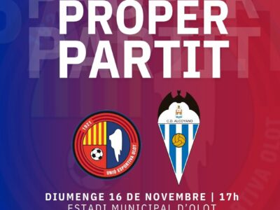 La Unió Esportiva Olot espera retrobar-se amb la victòria en el segon partit consecutiu a l'Estadi Municipal. Serà aquest diumenge (17h) contra el CD Alcoyano, que arriba amb la moral ben alta després de superar l'Atlètic Lleida. Els visitants es troben igualats a punts amb els de Roger Vidal, que intentaran recuperar la punteria i mantenir la imbatibilitat a casa. Torna el capità Pedro del Campo, és dubte Andreu Guiu i són baixa Martí Soler, per lesió, i Pau López, sancionat. Ens visitarà el CF Les Preses i l'Escola La Bòbila en una tarda amb Tercer Temps a l'ATN Bar Restaurant.