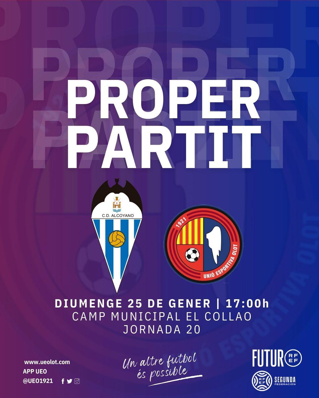 El rival d’aquest diumenge és el Club Deportivo Alcoyano SAD, fundat l’any 1928 i que disputa els seus partits al Gestaser El Collao, amb capacitat per a 4.850 espectadors. Un club històric del País Valencià amb quatre temporades a Primera Divisió i dotze a Segona Divisió A, també a la nova Primera RFEF (4) i Segona Divisió B (29). A les ordres del valencià Fran Alcoy, en aquest mercat d’hivern s’han reforçat amb dues incorporacions, l’extrem Rubén Carretero (SD Ibiza) i el jove davanter Alejandro Morales (CP Cacereño). Per aquest partit tindran les baixes dels sancionats Solbes i Adri Lledó. Un conjunt, atenció, que fa deu jornades que no coneix la derrota amb sis porteries a zero. De fet, és el segon equip que menys encaixa (13) darrere del Poblense. Això sí, encadena tres empats seguits que l’han desbancat de la zona noble, ara a dos punts de distància. El seu màxim realitzador és Rubén Català, autor de quatre dianes.