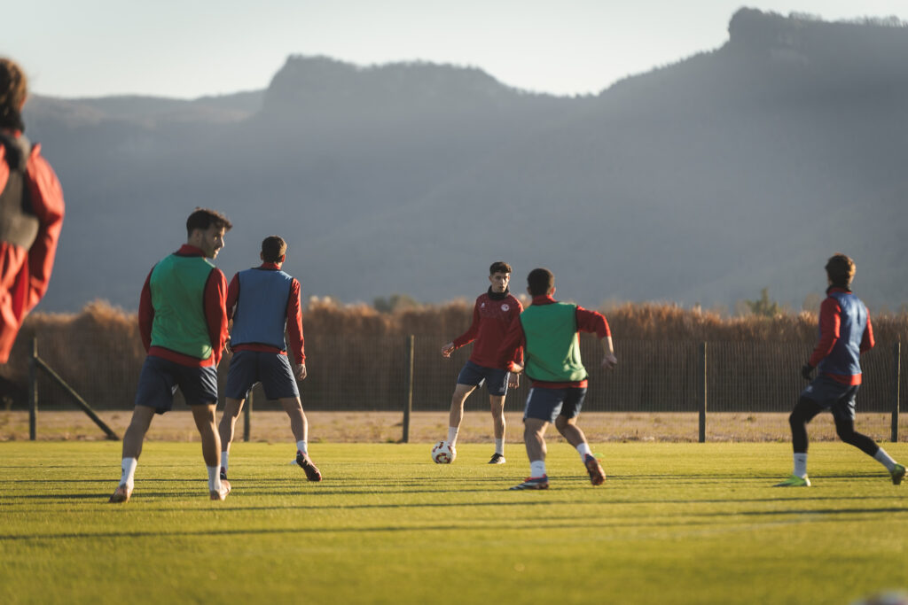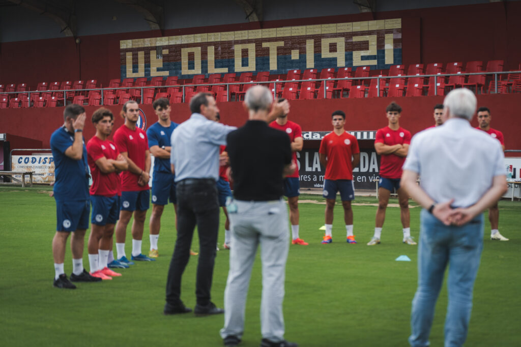 Galeria de fotos de la visita de l'alcalde de la ciutat d'Olot, Pep Berga, a l'entrenament del primer equip per donar ànims i desitjar sort a la plantilla i cos tècnic de cara a la nova temporada a Segona Federació.