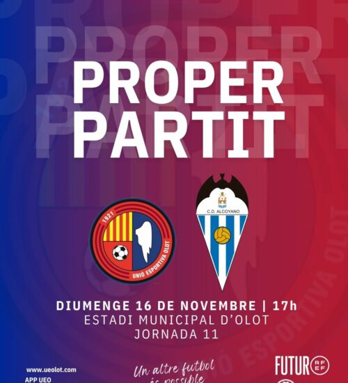 La Unió Esportiva Olot espera retrobar-se amb la victòria en el segon partit consecutiu a l'Estadi Municipal. Serà aquest diumenge (17h) contra el CD Alcoyano, que arriba amb la moral ben alta després de superar l'Atlètic Lleida. Els visitants es troben igualats a punts amb els de Roger Vidal, que intentaran recuperar la punteria i mantenir la imbatibilitat a casa. Torna el capità Pedro del Campo, és dubte Andreu Guiu i són baixa Martí Soler, per lesió, i Pau López, sancionat. Ens visitarà el CF Les Preses i l'Escola La Bòbila en una tarda amb Tercer Temps a l'ATN Bar Restaurant.
