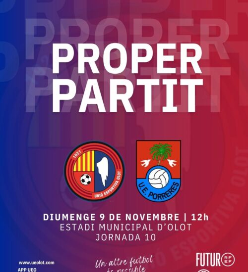 La Unió Esportiva Olot vol ratificar els grans números com a local amb la visita aquest diumenge (12h) d'un rival força directe a la classificació, la UE Porreres. El conjunt mallorquí, que s'estrena per primer cop a la categoria, ve de guanyar al Sant Andreu i agafar impuls amb el nou entrenador, Jaume Mut. Plaga de baixes al bàndol olotí amb les sancions de Pedro, Martí Soler i Pau López i les lesions de Guiu i Fuentes. Seran dubte Ayala i Arumí en una matinal amb el bus del Banc de Sang i Teixits i la visita del CF Sant Roc a més de les iniciatives habituals per tenyir el camp de vermell.